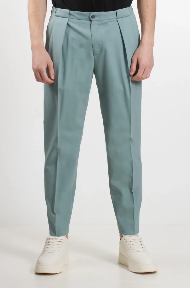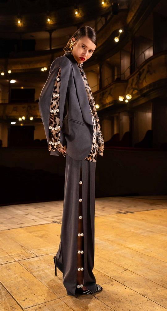 Pantalone con dettaglio 5 Progress, modello con gamba larga e tasche posteriori, dettaglio con spacchi laterali e bottoni e perle oversize, colore grigio