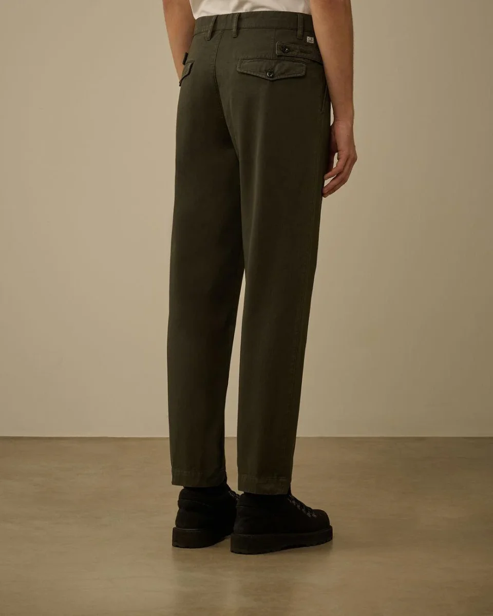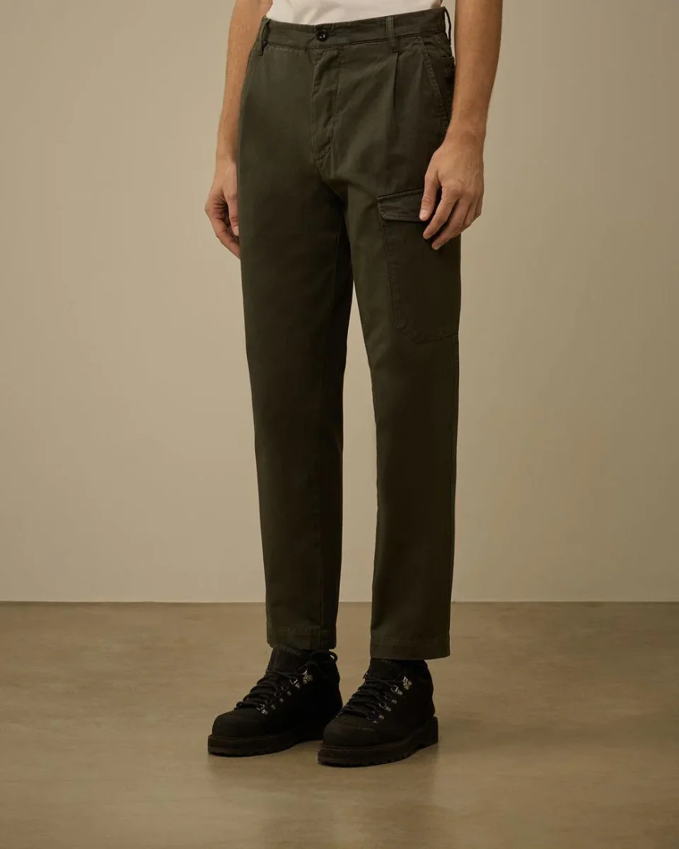 Pantaloni CP Company cargo realizzati in Gabardine di cotone. Il modello presenta chiusura con bottone, pinces, passanti per la cintura, tasche laterali e tasca cargo con bottone, colore grigio