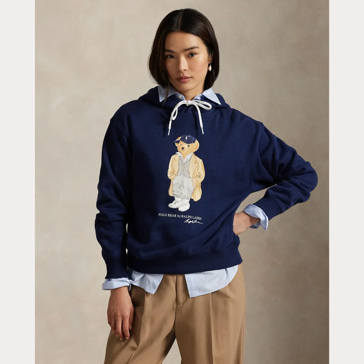 Felpa Polo Ralph Lauren donna, modello realizzato in pile, cappuccio fisso con coulisse, dettaglio con iconico Polo Bear stampato al centro, colore blu