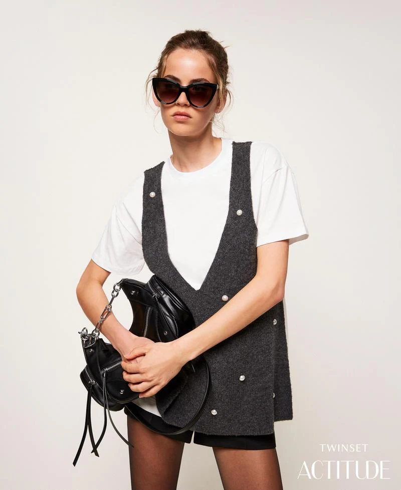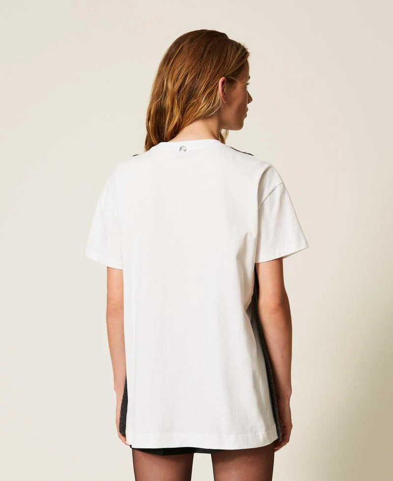 T-shirt Twinset Actitude, modello in maglia con applicazione perle, girocollo e placchetta logo sul retro