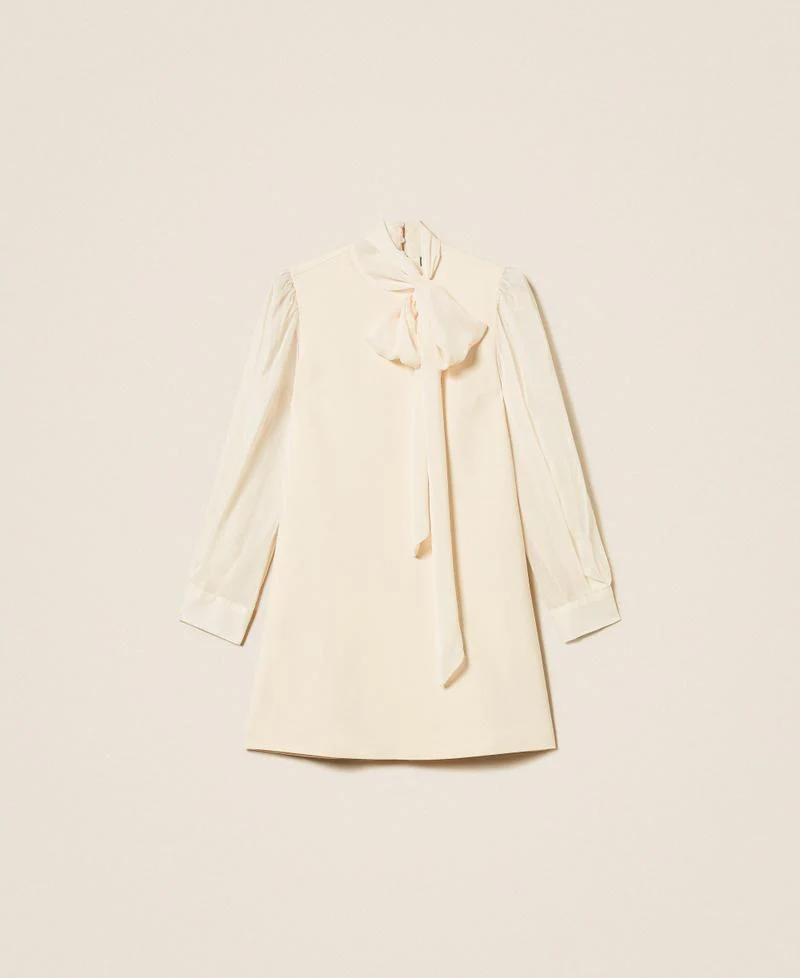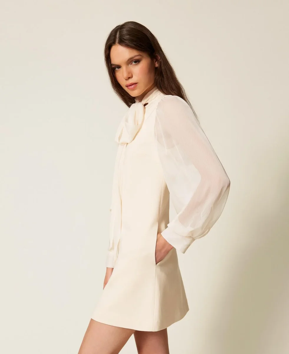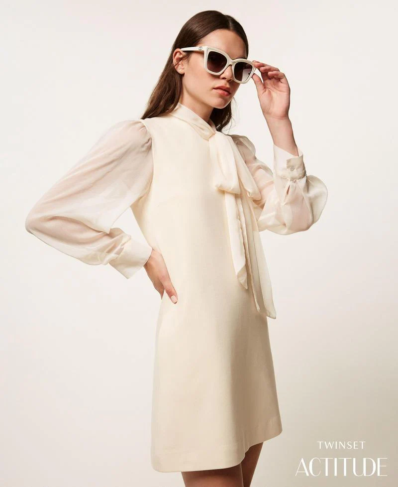 Abito corto Twinset Actitude, modello in punto Milano con maniche a voile, collo alto e fusciacca annodabile a fiocco, chiusura a goccia con bottoncini sul retro, oblò ampio sulla schiena, colore bianco