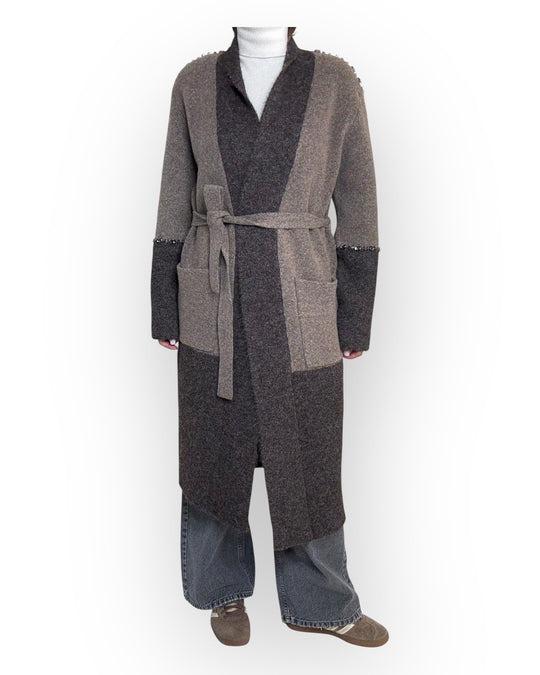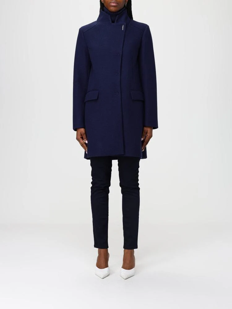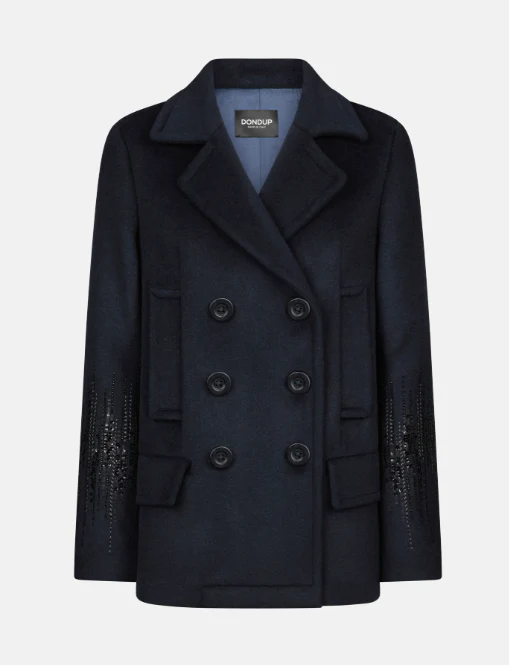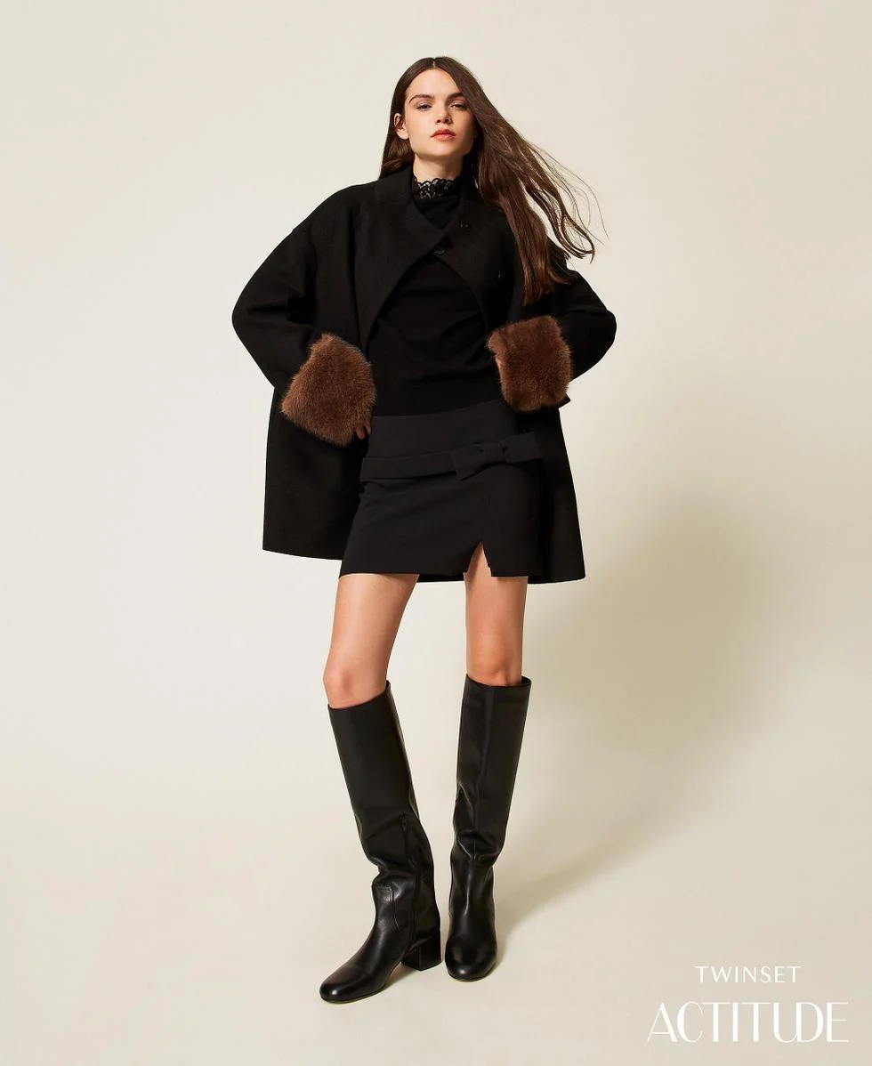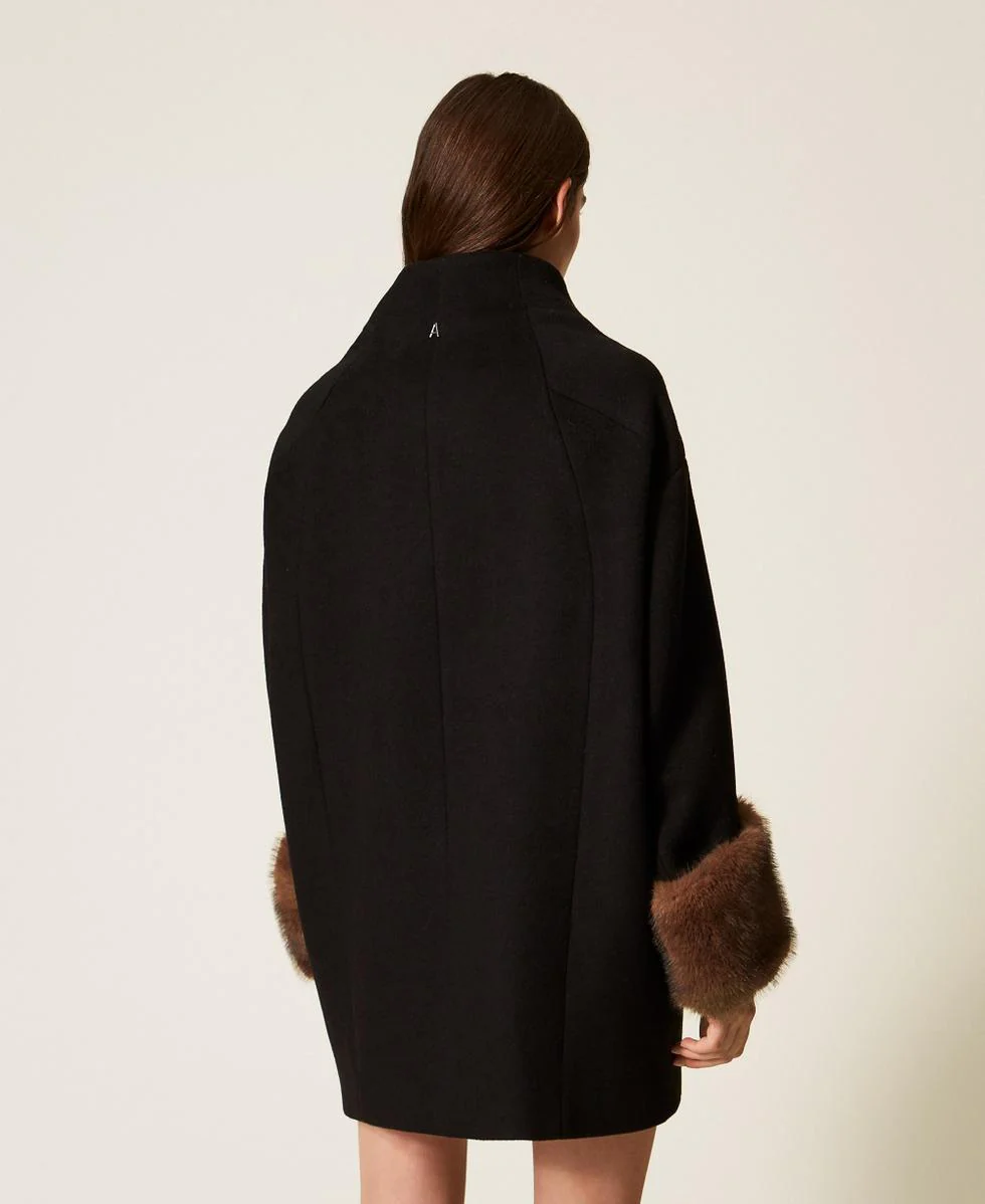 Cappotto Twinset Actitude, modello in panno velour con polsini rimovibili in pelliccia sintetica effetto visone, collo alto a cratere, maniche lunghe a kimono, chiusura con bottoni nascosti