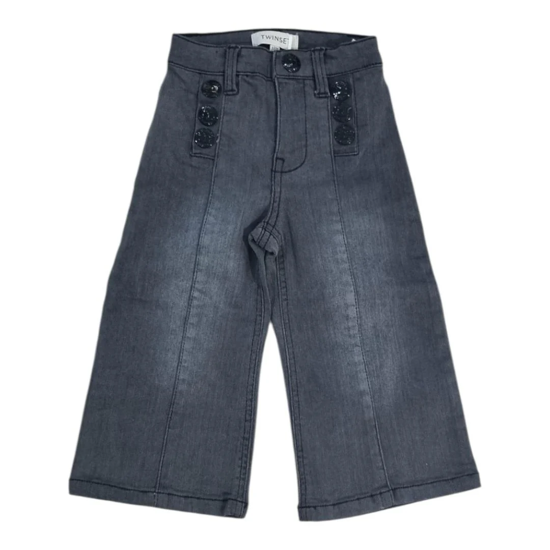 Jeans in denim Twinset Girl, modello ampio con applicazione gioiello sul davanti, chiusura bottone e passanti per cintura