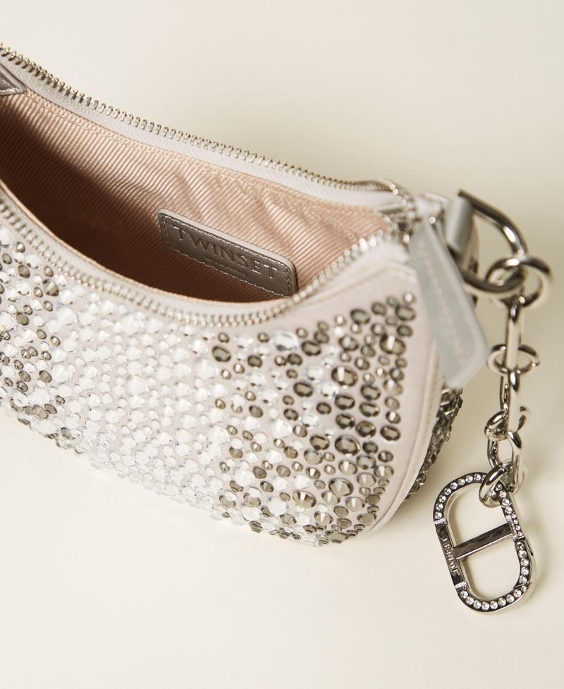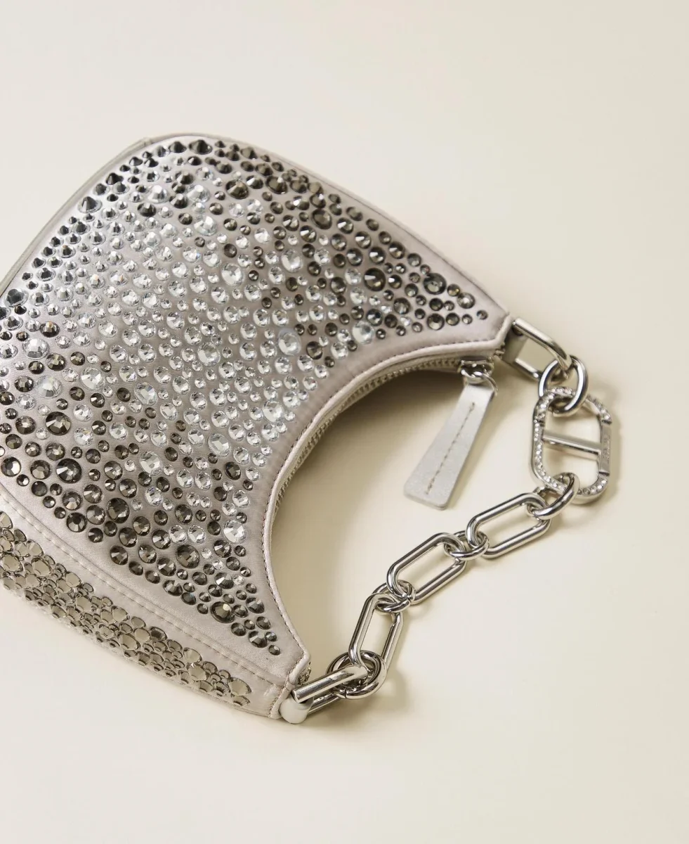 Borsa croissant in raso con applicazione di strass termosaldati, effetto cromatico degradè, dettagli effetto pelle di vitello e chiusura con zip in catena, colore argento