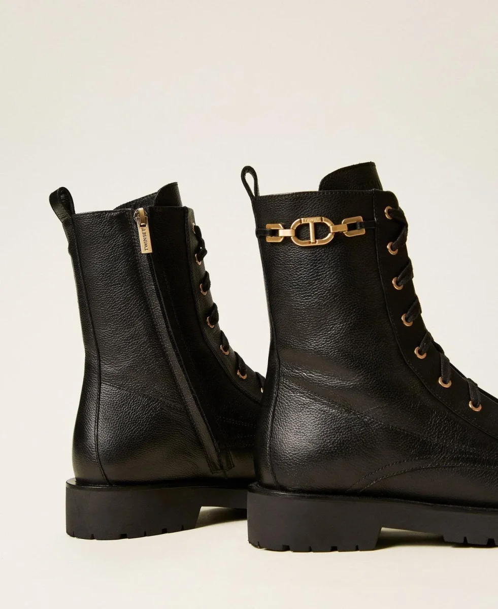 Anfibio Twinset, modello in pelle con inserto in catena e logo Oval T in metallo, zip centrale, lacci sul davanti e fondo in gomma, colore nero