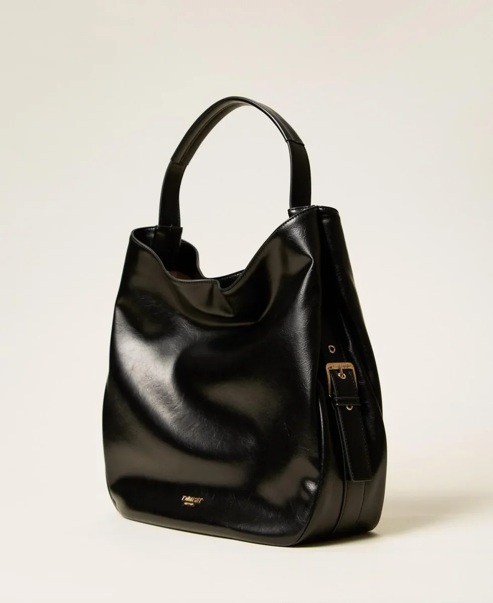 Borsa hobo effetto pelle di vitello, verniciato semilucido, fibbie laterali logate, chiusura con magnete centrale, manico a spalla, colore nero