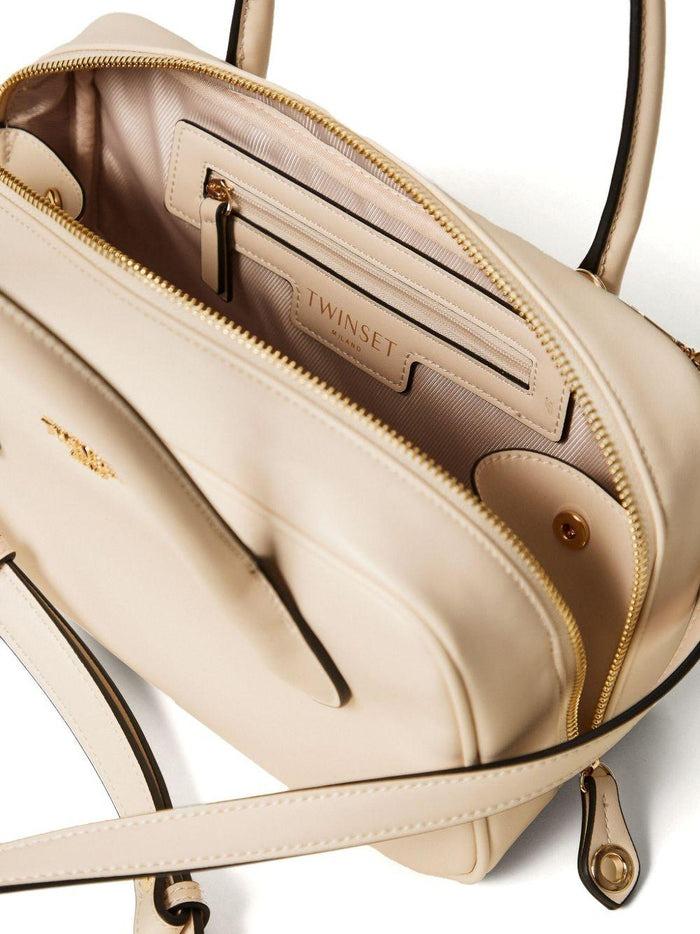 Borsa tote in colore beige con manico, chiusura superiore con zip e dettagli color oro. Il design rettangolare è arricchito da una tracolla rimovibile
