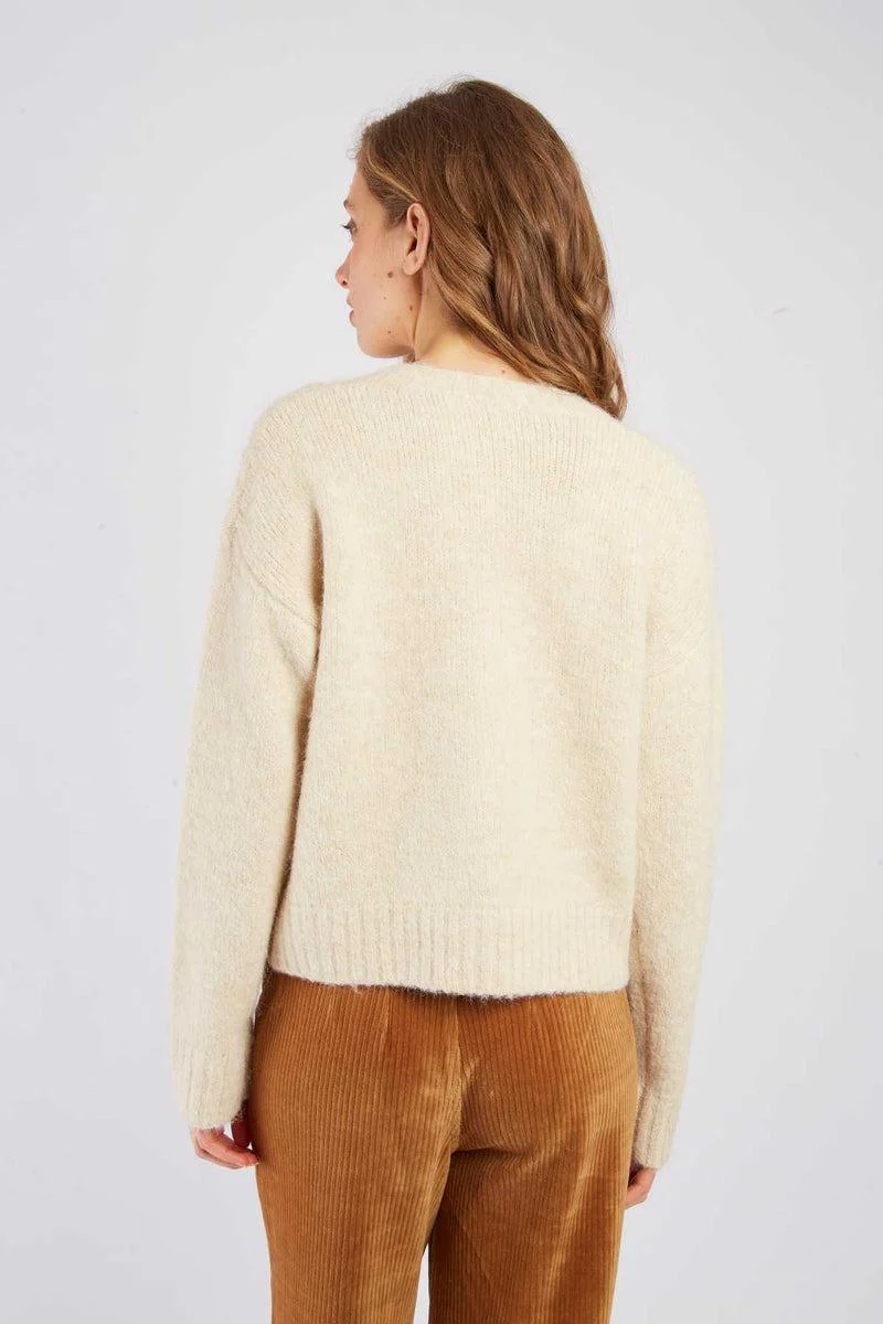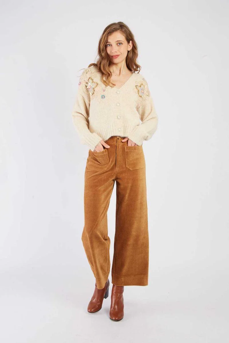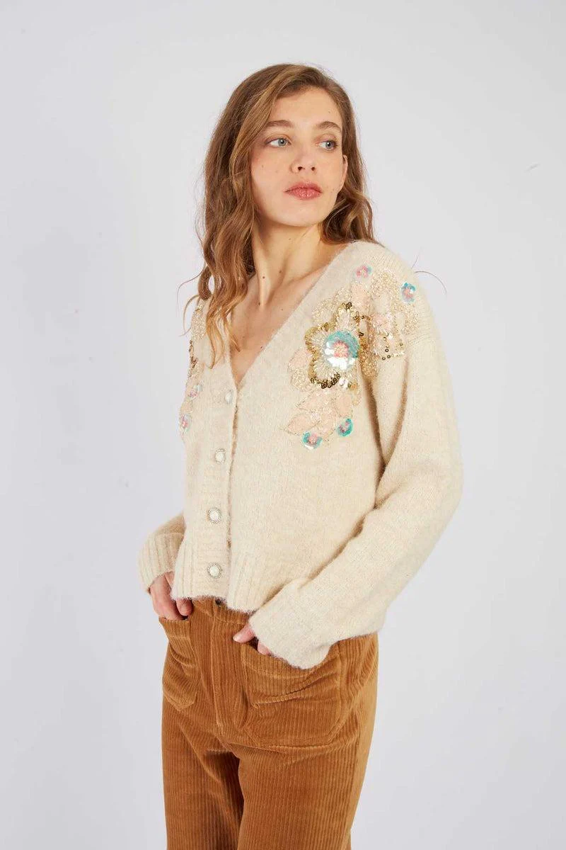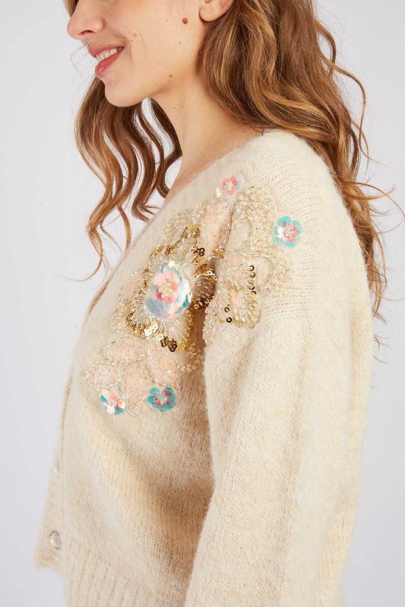 Cardigan in morbida maglia a coste di perline, carrè floreale con perline e pailettes sulla manicha, taglio dritto e scollo rotondo, colore bianco