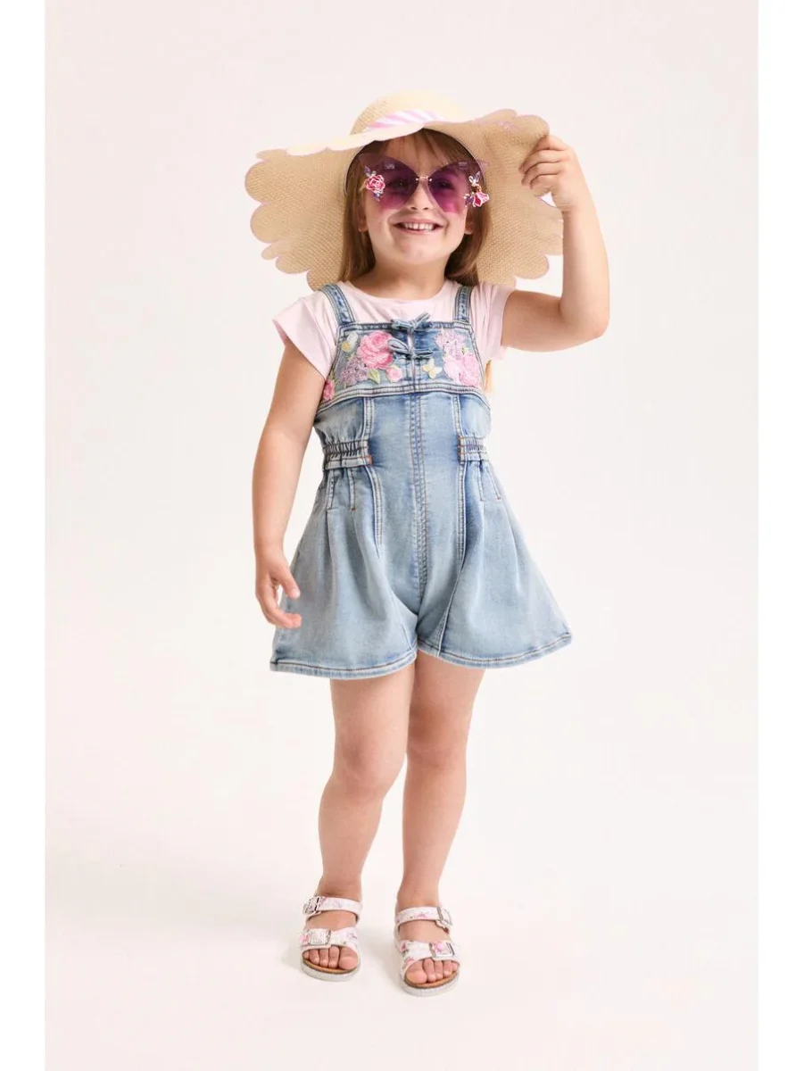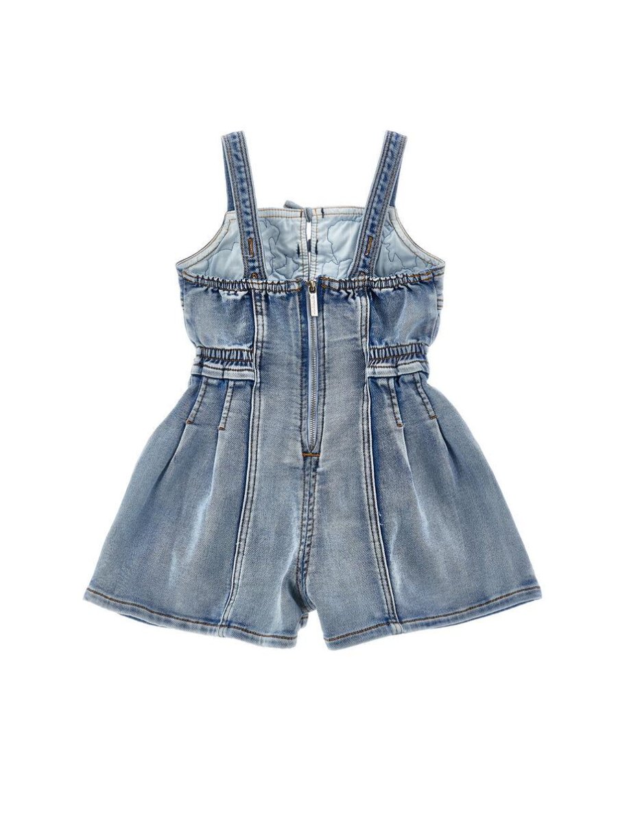 Tutina in denim con bretelle regolabili, decorato con patch floreali e fiocchetti sul corpetto, elastico in vita, chiusura posteriore con zip, colore blu denim