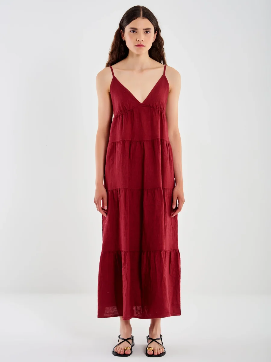 Abito a balze Vicolo, modello con scollo a V, spalline sottili regolabili e dettaglio elastico sul retro, colore rosso