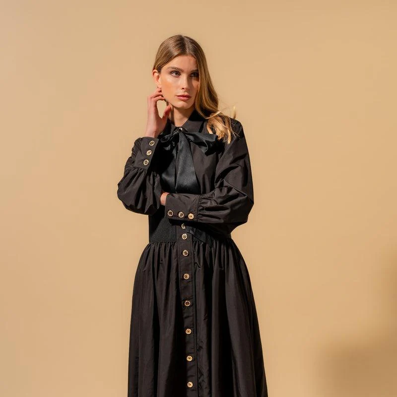Abito Edward Achour Paris, modello chemisier con lucentezza satinata, vistosa scollatura a papillon e bottoni dorati, colore nero