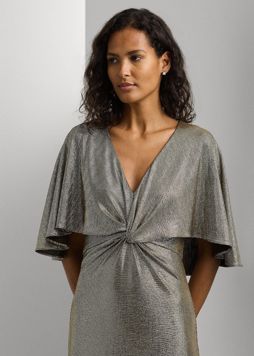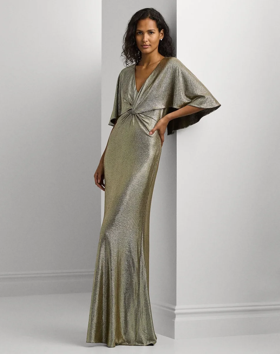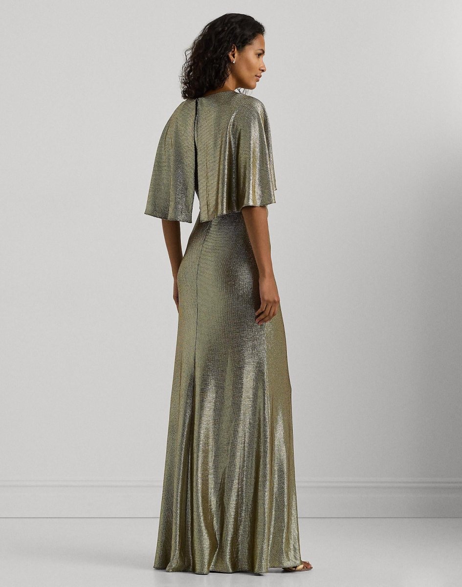 Abito a mantella Lauren di Ralph Lauren, scollo a V, cerniera centrale posteriore nascosta con chiusura a gancio, silhouette senza maniche con mantello, pinces sul seno, colore verde botanica