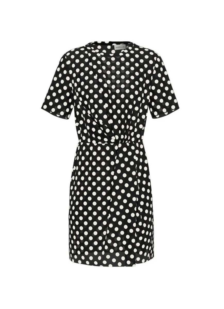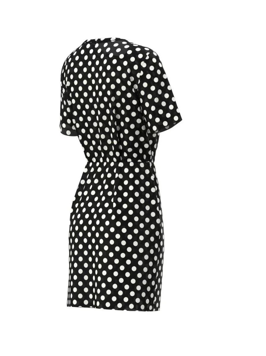 Abito in georgette di misto viscosa stretch, scollo rotondo e maniche corte, chiusura posteriore con zip, fantasia a pois all over