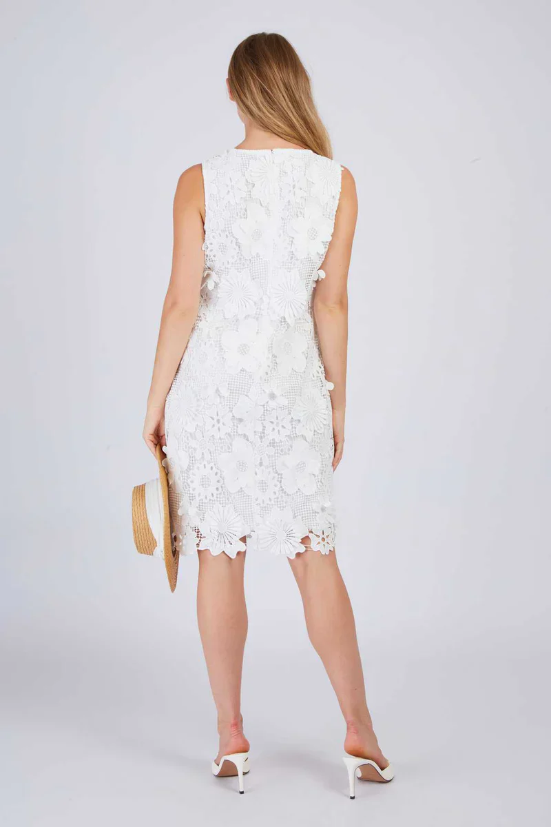 Abito a tubino in pizzo, modello smanicato, scollo rotondo, tessuto interamente in pizzo con motivi floreali, colore bianco