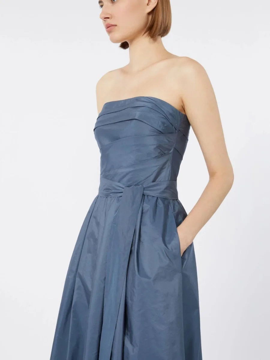 Abito in taffetà misto seta, modello smanicato, scollo dritto, chiusura con lampo invisibile sul retro, tasche inserite nei fianchi, cintura abbinata in vita, color avio