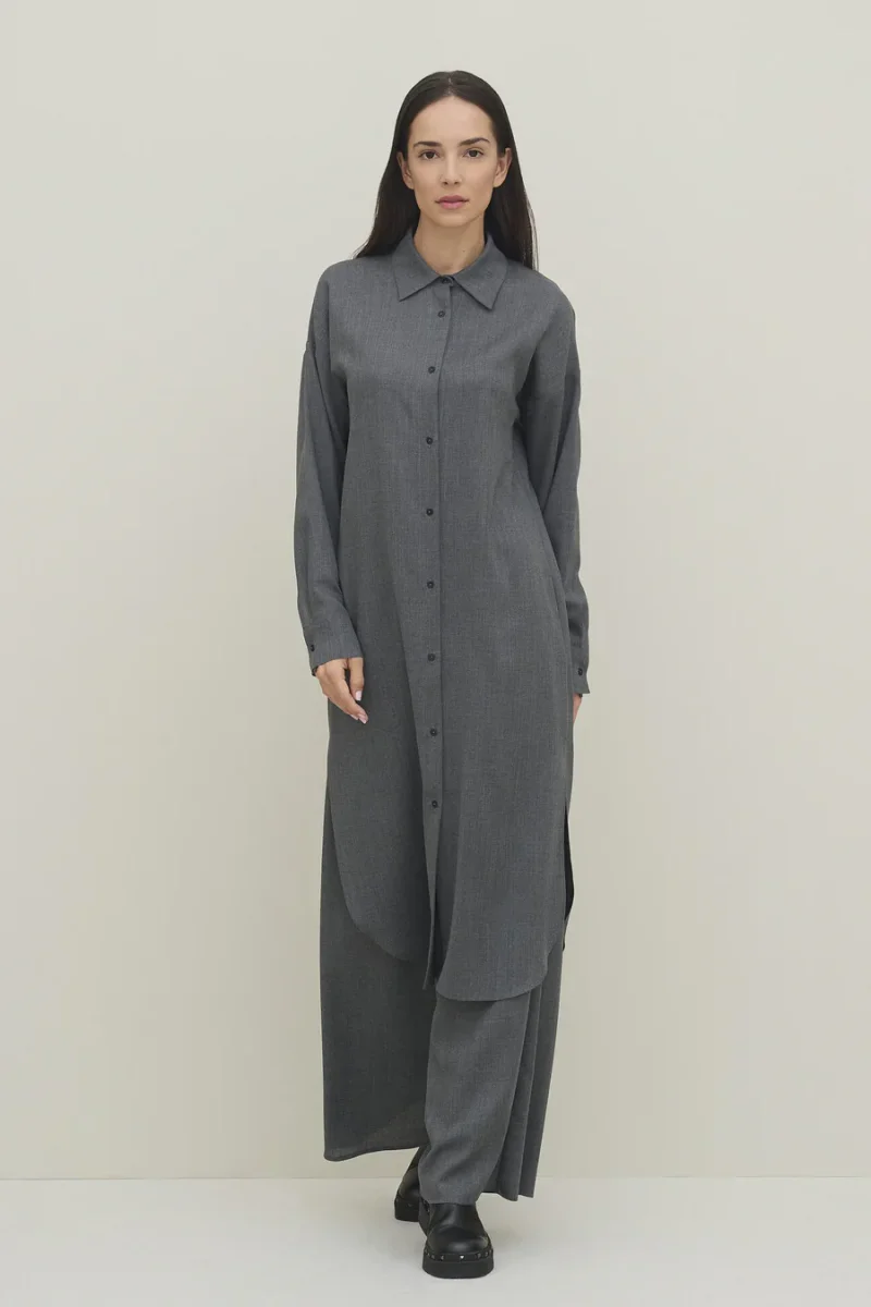 Abito chemisier Carla G, modello in garza di lana con collo classico e allacciatura frontale con bottoni madreperla, fondo leggermente stondato e ampi spacchi, colore grigio
