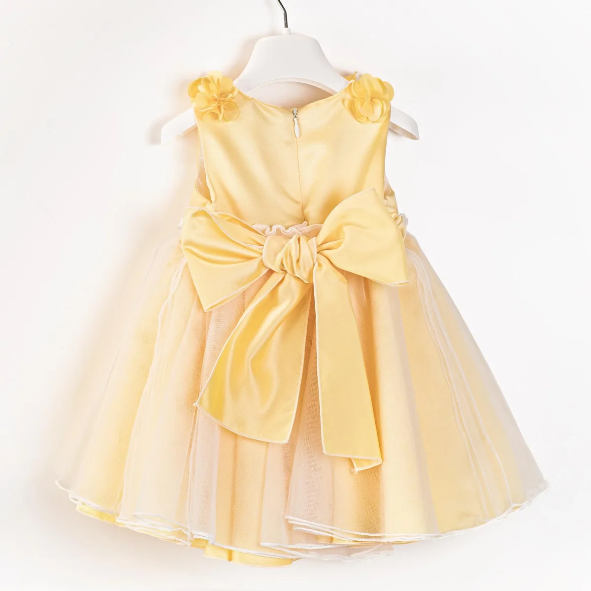 Abito Pure Firenze, modello girocollo con applicazione fiori in tono, cinta in vita, gonna ampia, colore giallo