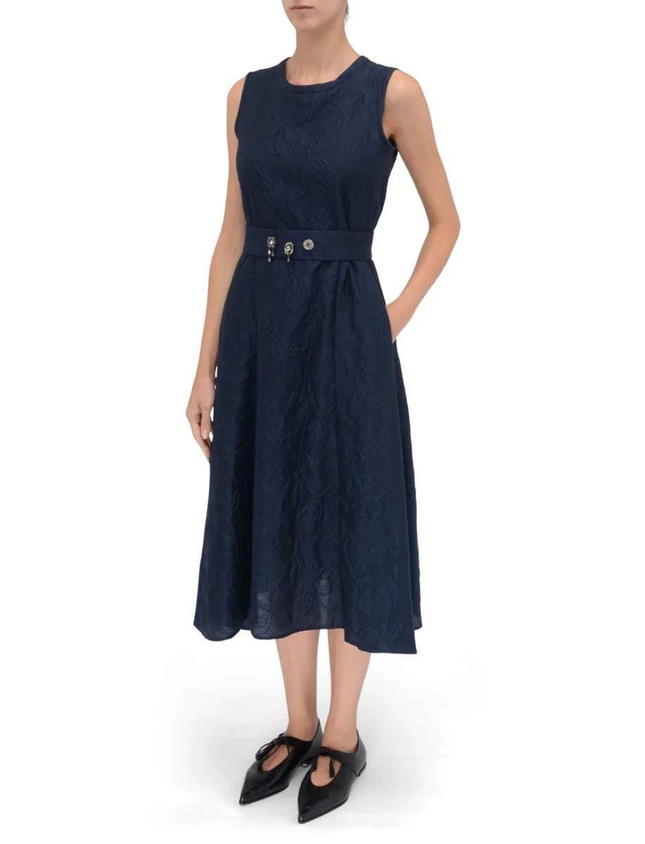 Abito in misto cotone e seta con disegno jacquard, girocollo, chiusura con zip invisibile sul retro, tasche inserite nei fianchi, cintura regolabile con bottoni a pressione, applicazione gioiello sulla cintura