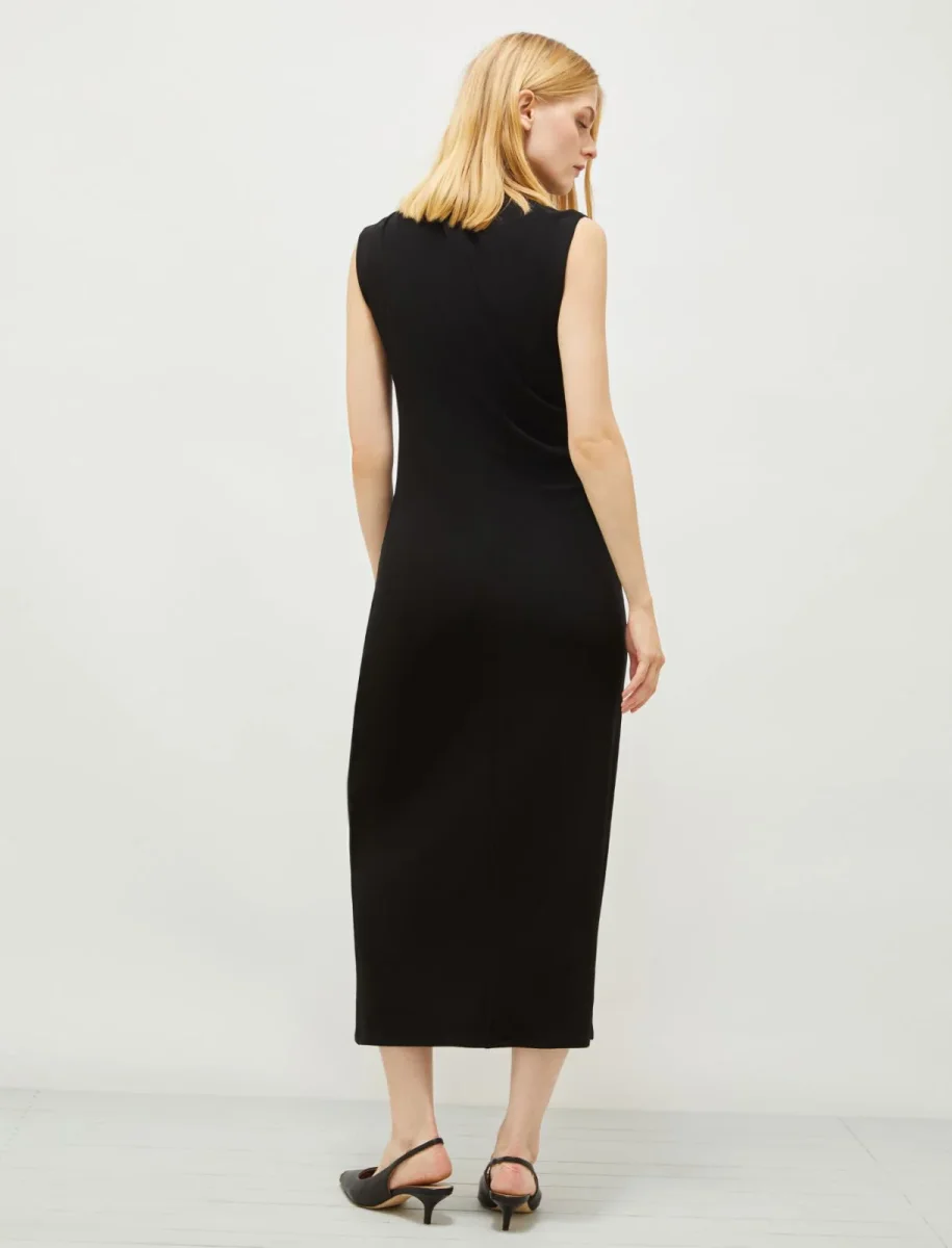 Abito Marella in jersey interlock, modello smanicato con collo rialzato, motivo di arricci in vita, chiusura con zip posteriore, doppiato in tulle, colore nero