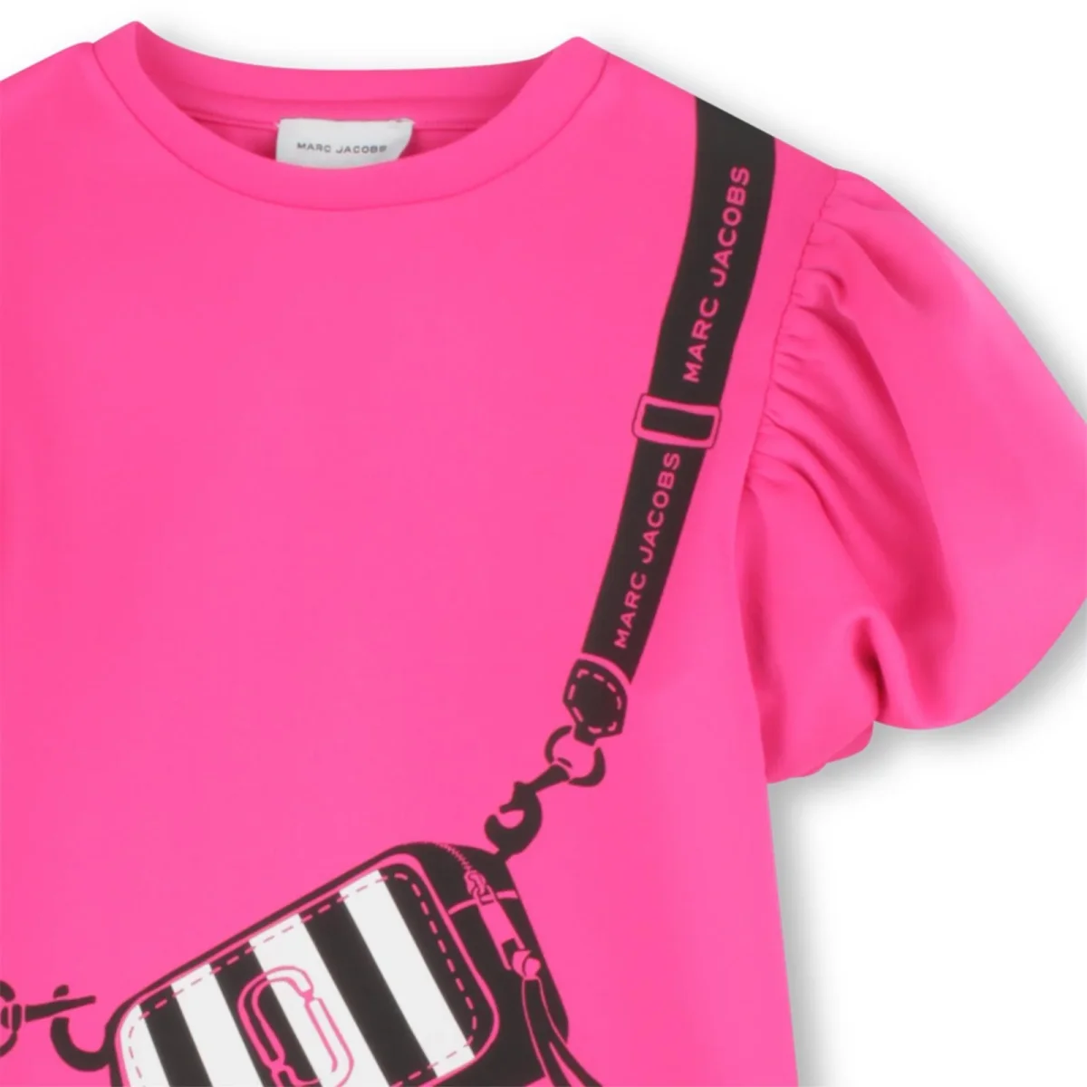 Abito Marc Jacobs Kids, modello girocollo in cotone, maniche leggermente a palloncino, dettaglio con stampa iconica marsupio, colore fucsia