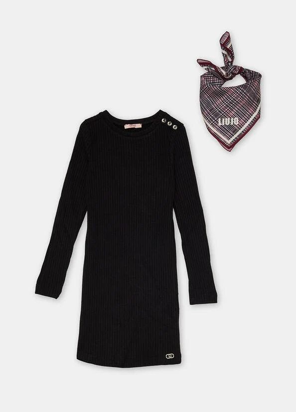 Abito in maglia di viscosa, lavorazione a costine, taglio girocollo con foulard, maniche lunghe, bottoni sulla spalla, logo in metallo, colore nero