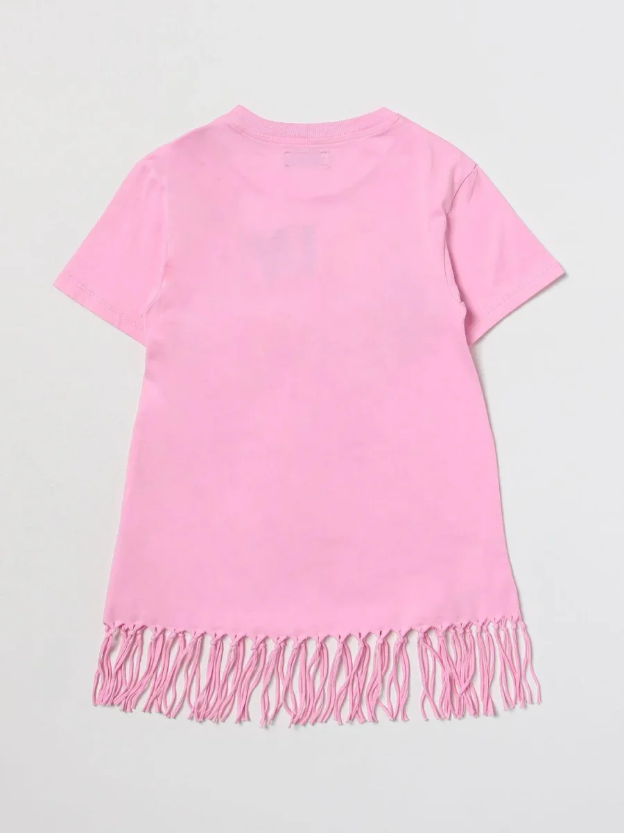 Abito multicolor Mc2 Saint Barth, modello girocollo, maniche corte, dettaglio con frange e fantasia multicolor, colore fucsia, e scritta in contrasto multicolor