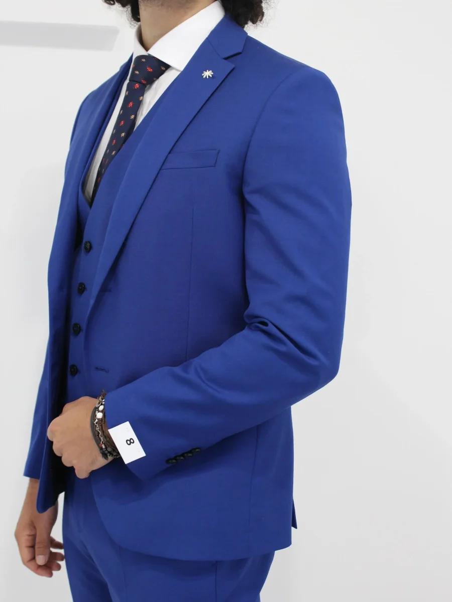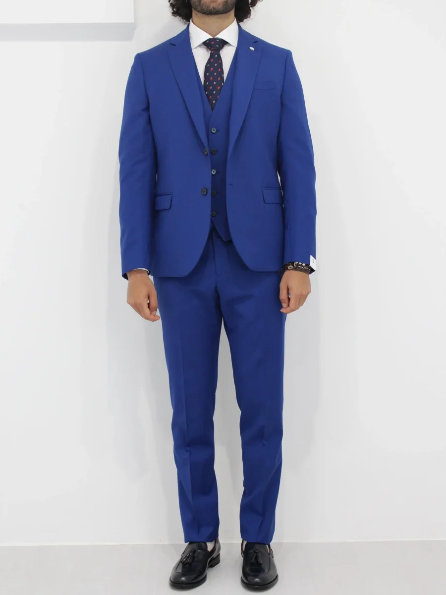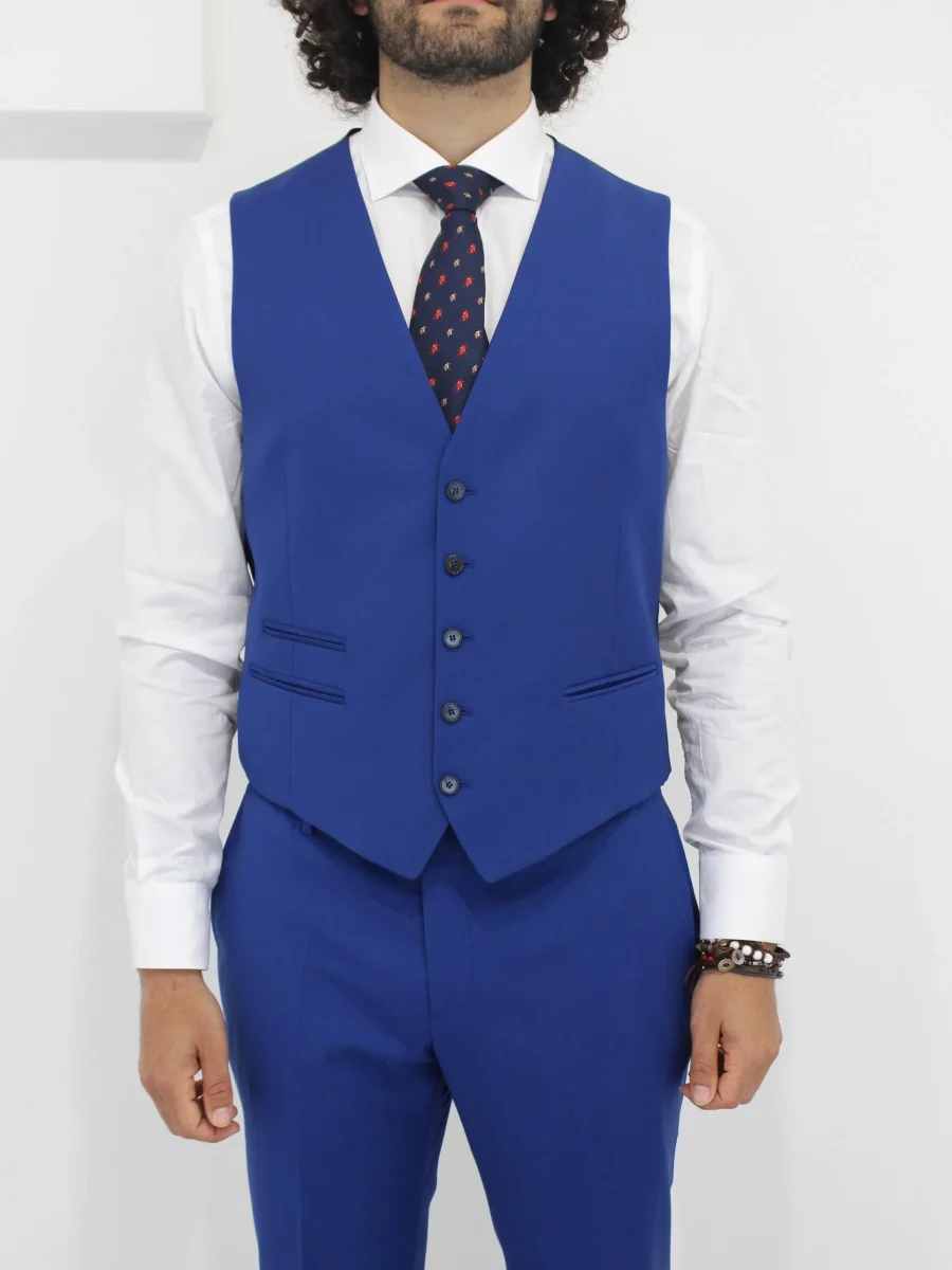 Abito tre pezzi Manuel Ritz uomo, giacca con colletto classico, bottone frontale, tasca sul petto, e due tasche frontali con patta, polsino con bottoni. Gilet con scollo a V e chiusura frontale con bottoni, tasche laterali. Pantalone con passante per cintura e bottoncino e zip, tasche laterali. Colore blu elettrico