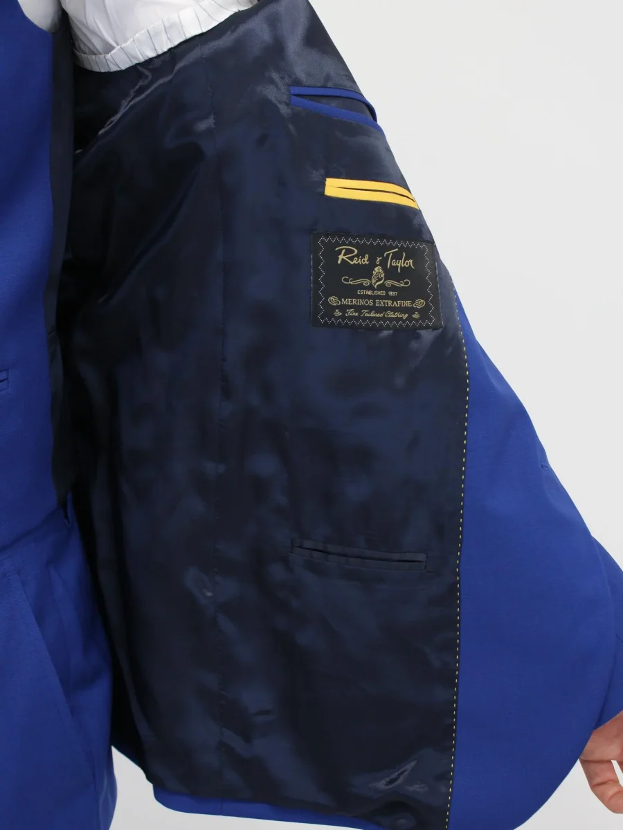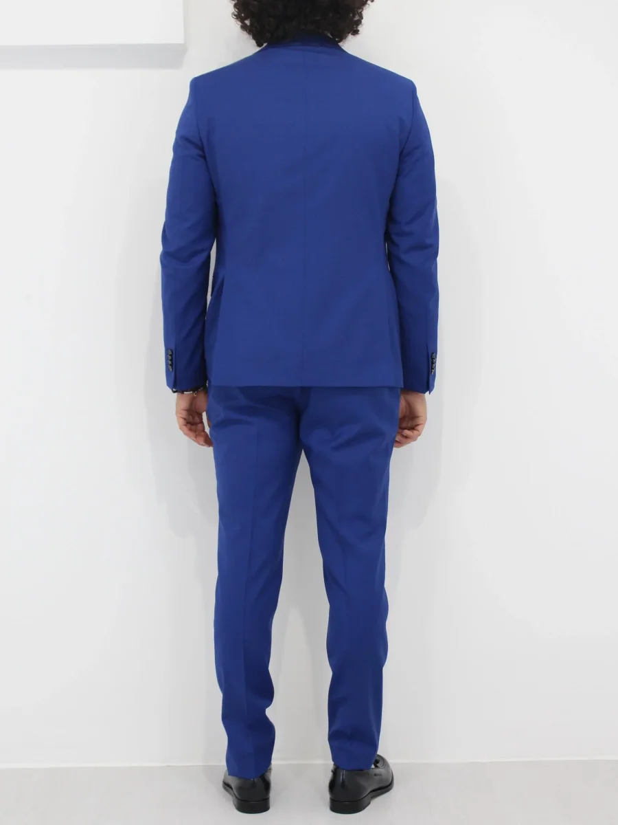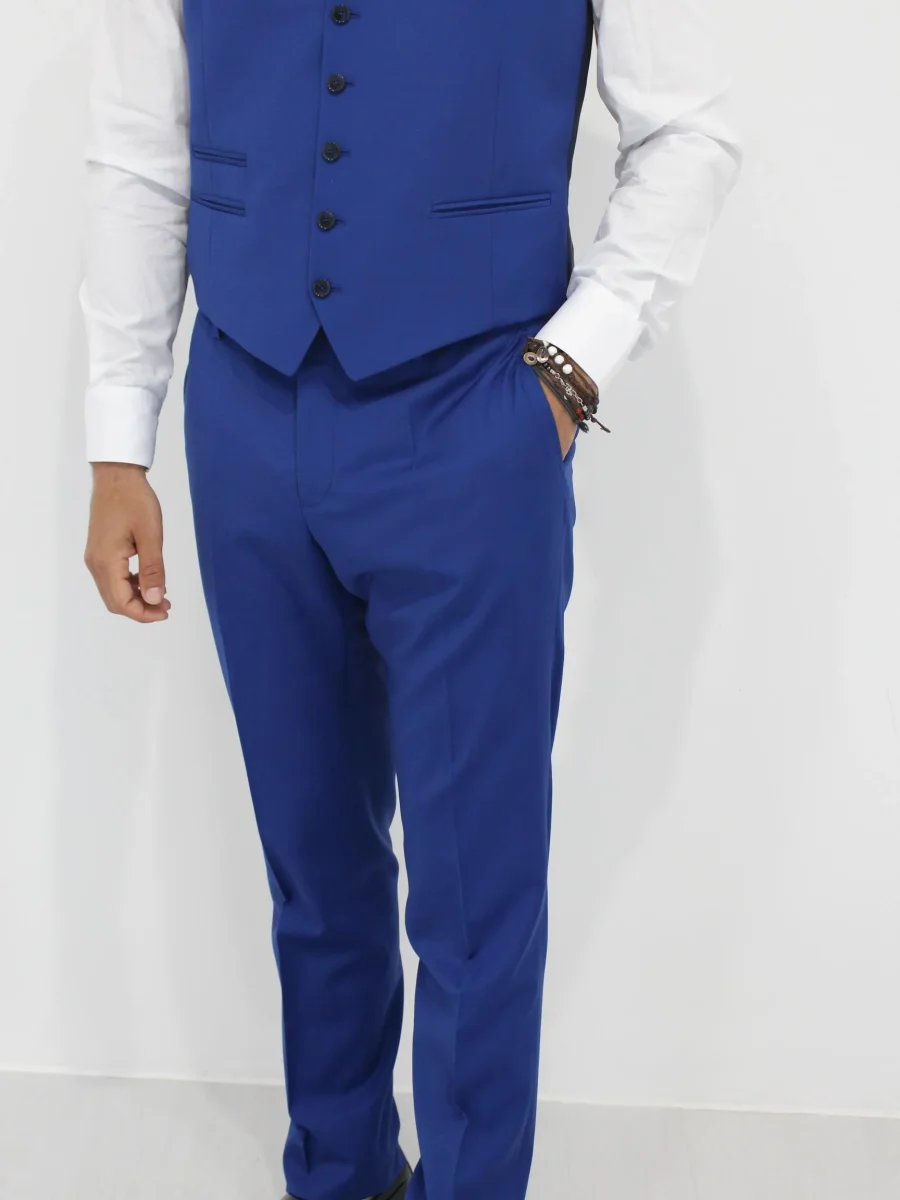 Abito tre pezzi Manuel Ritz uomo, giacca con colletto classico, bottone frontale, tasca sul petto, e due tasche frontali con patta, polsino con bottoni. Gilet con scollo a V e chiusura frontale con bottoni, tasche laterali. Pantalone con passante per cintura e bottoncino e zip, tasche laterali. Colore blu elettrico