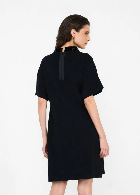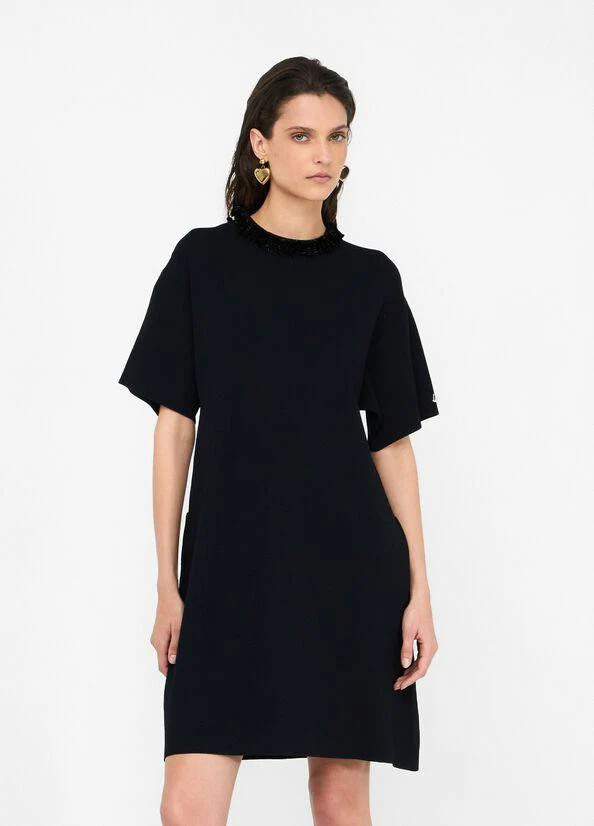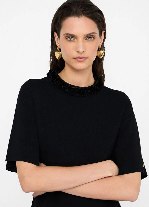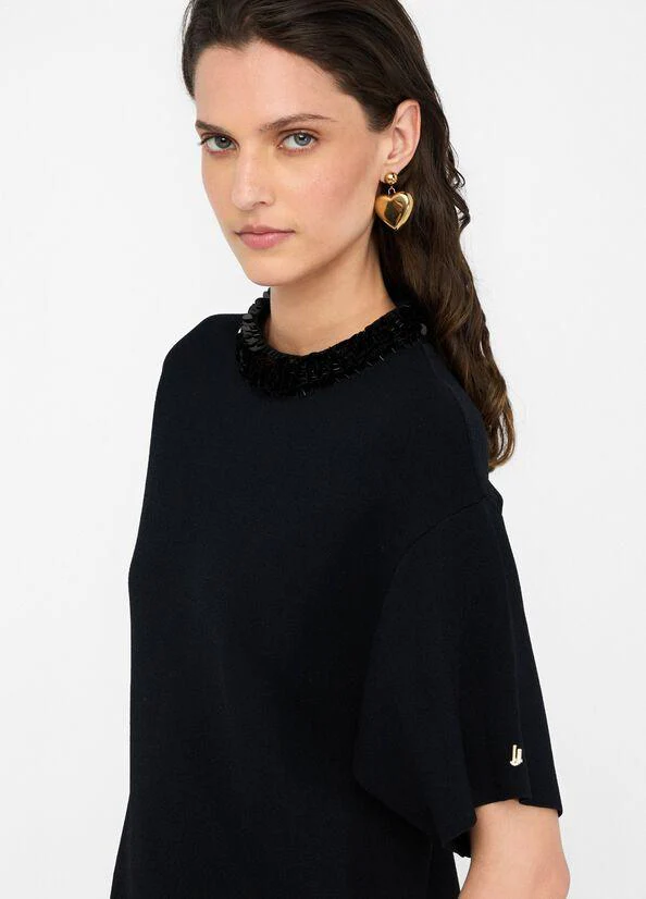 Abito Liujo black, modello midi, realizzato in maglia di misto viscosa, taglio girocollo con pailettes applicate e maniche corte, chiusura con zip sul retro, colore nero