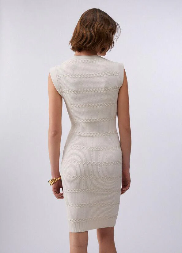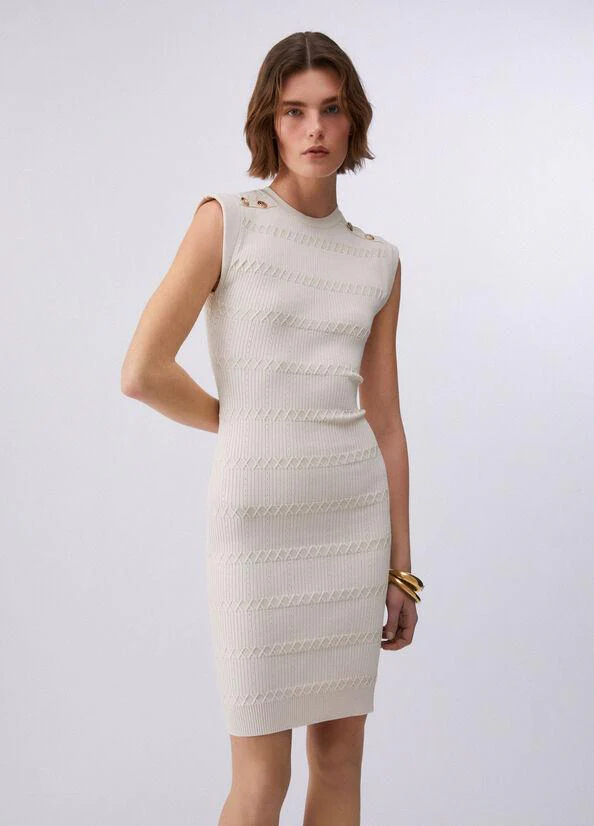 Abito corto in maglia, girocollo, bottoni dorati sulle spalle, colore cappuccino