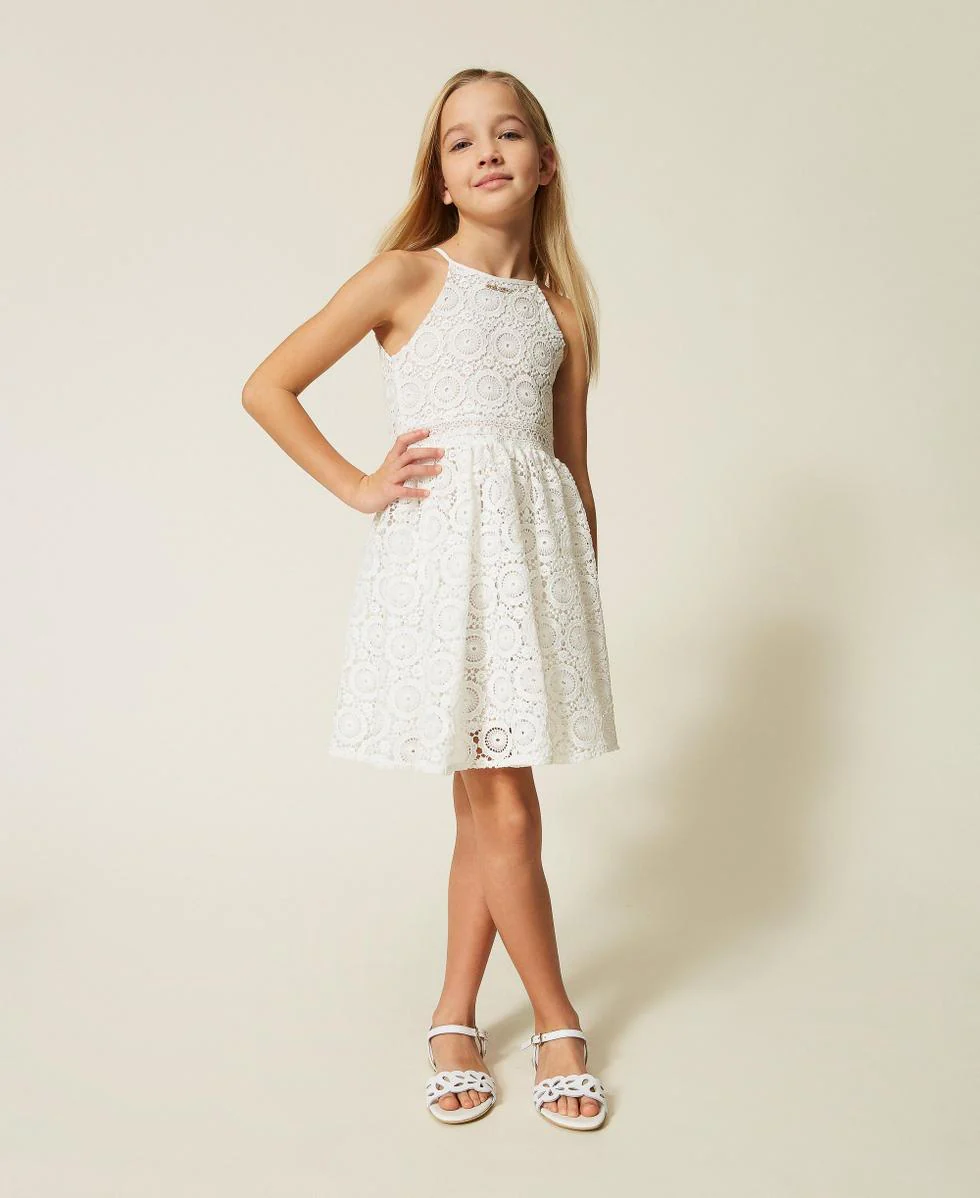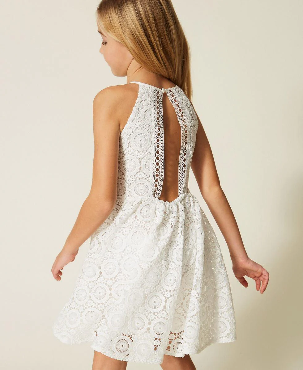 Abito corto in pizzo macramè, motivo geometrico, spalline sottili, scollo america, placchetta logo metallo, taglio in vita cut out, colore bianco