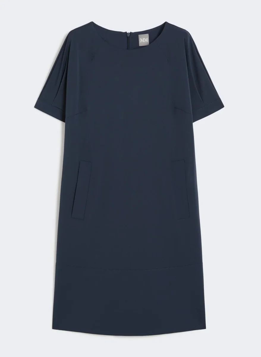Abito in jersey tecnico MM Max Mara, modello linea ad A, scollo a barchetta, maniche corte, chiusura con zip sul retro e tasche a filetto, colore blu