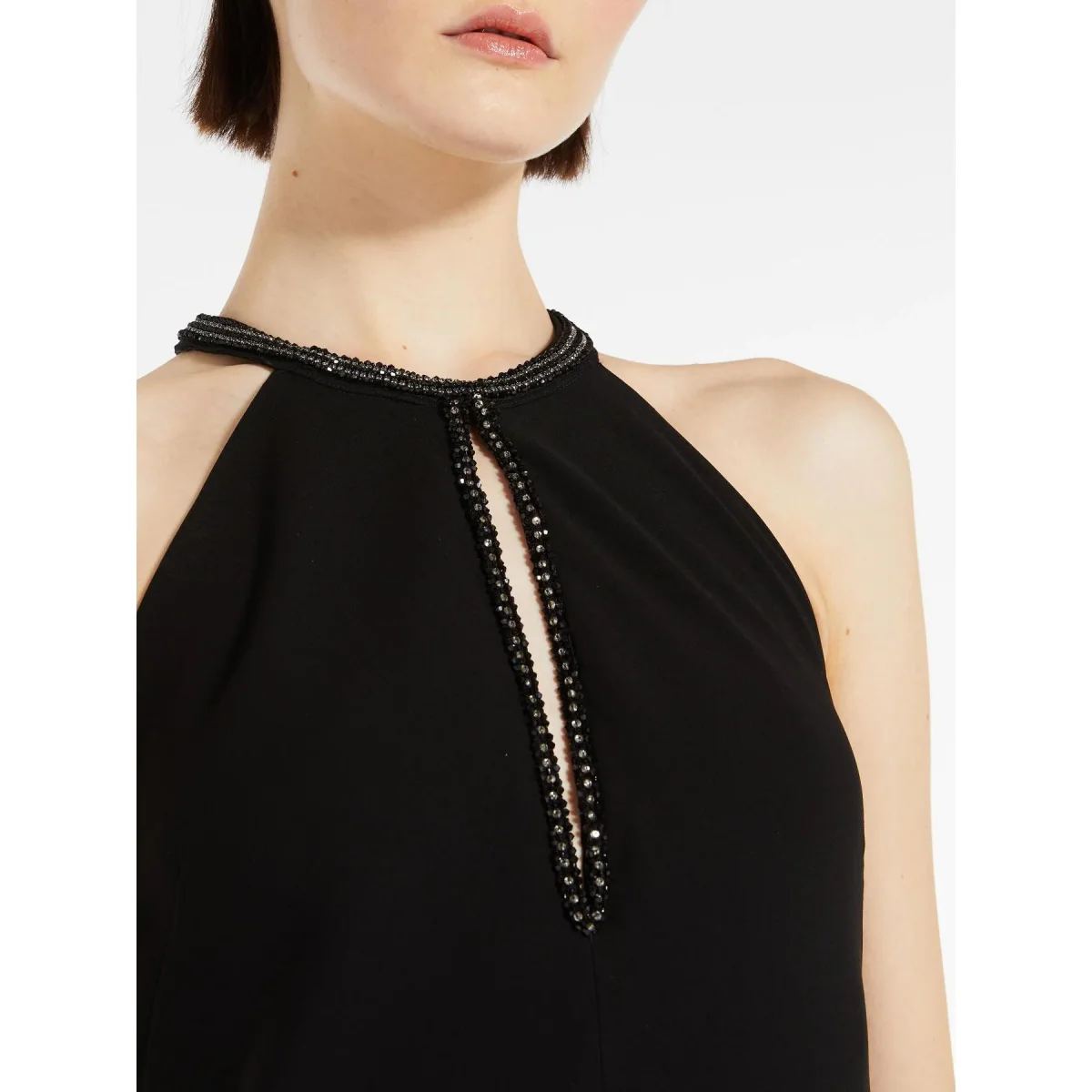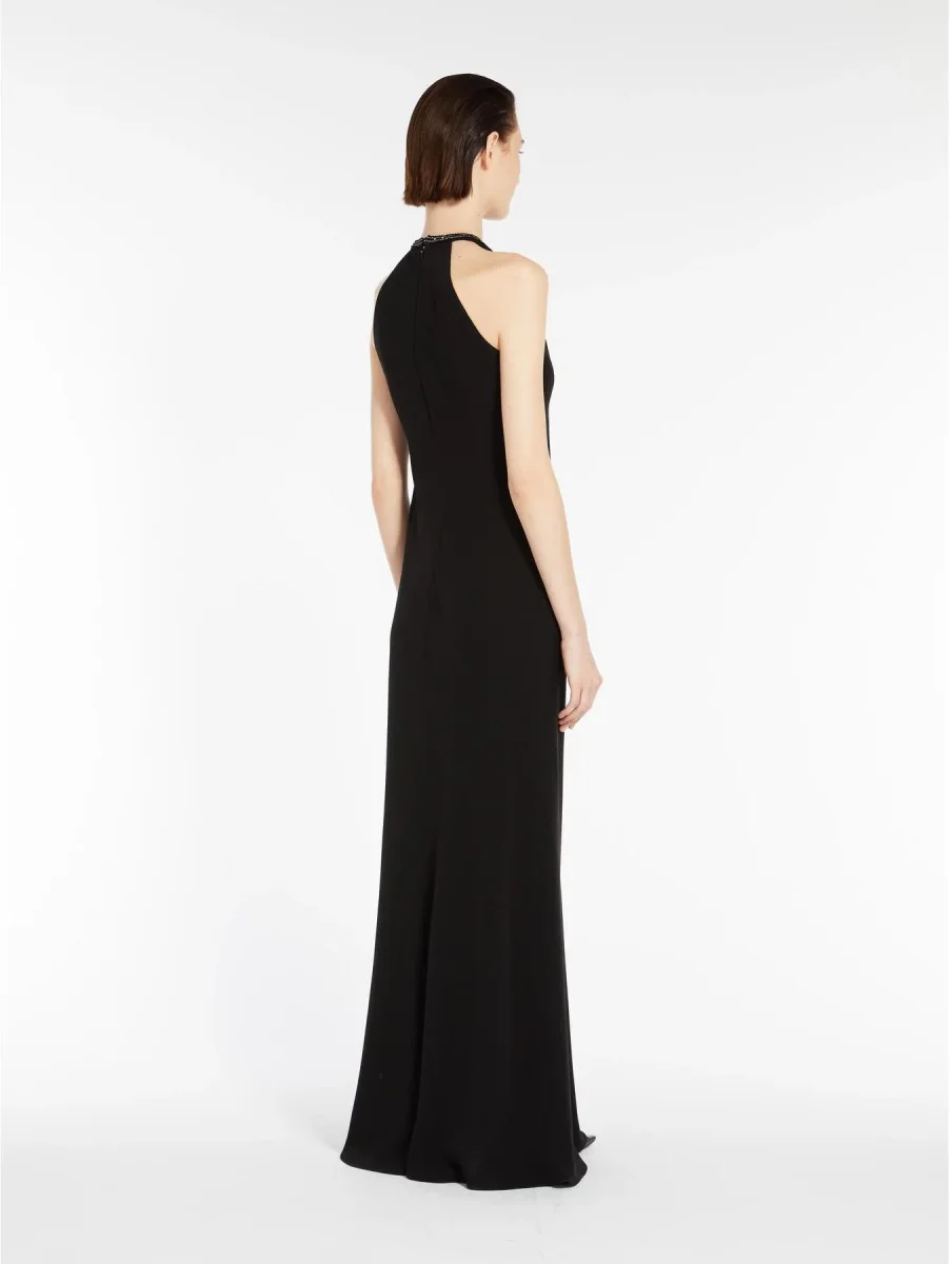 Abito lungo smanicato in tessuto leggero cady, scollo america con fondo a goccia sul decollette, cristalli in contrasto, chiusura con lampo sul retro, colore nero