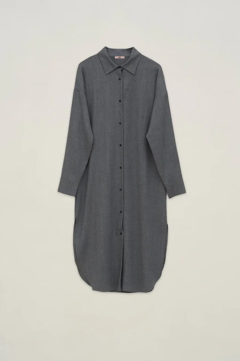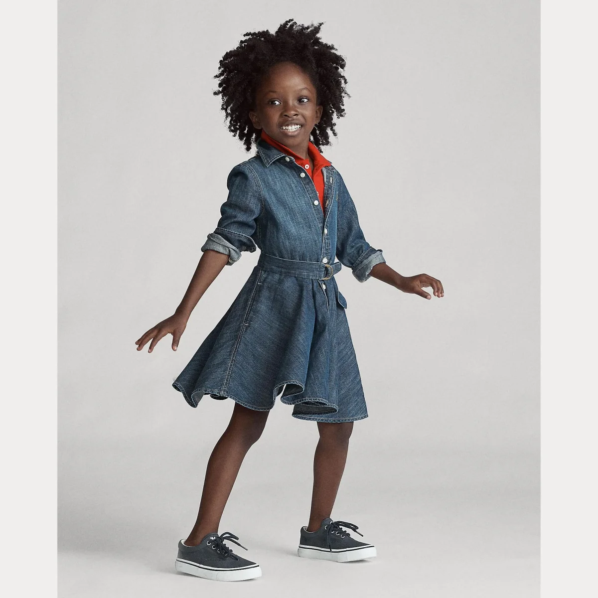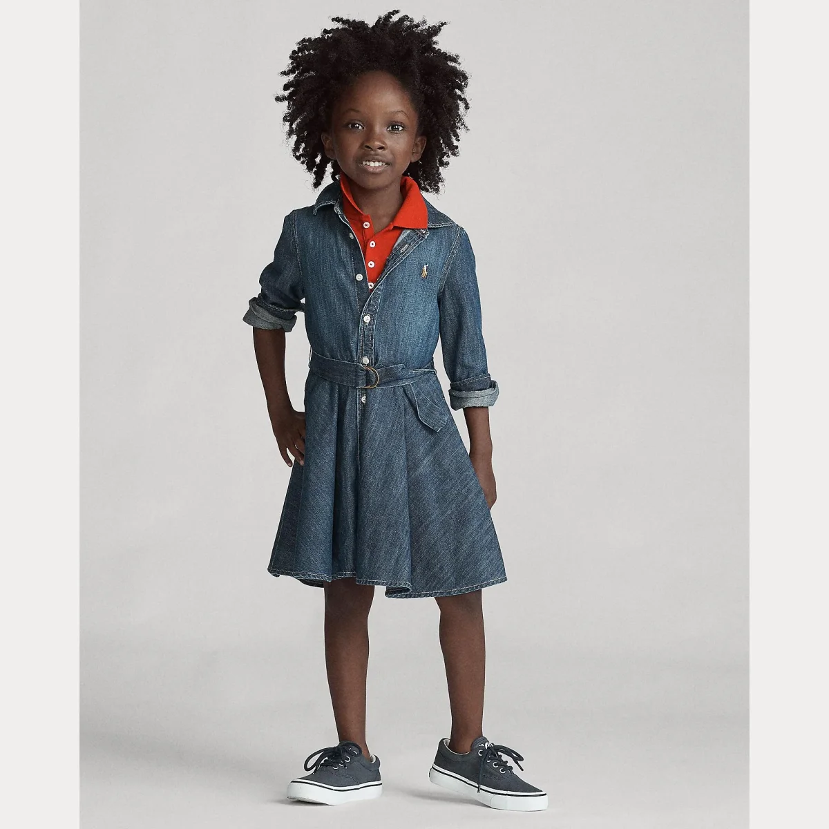 Abito Polo Ralph Lauren, silhouette aderente e svasata, pony ricamato in contrasto, colletto button down, patta con bototni, maniche lunghe con polsini, cintura rimovibile, colore blu denim