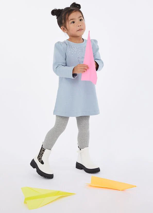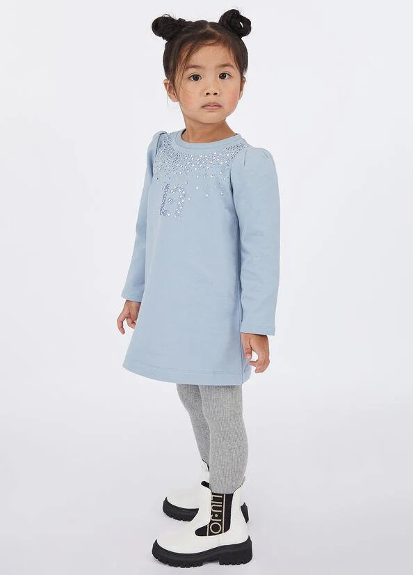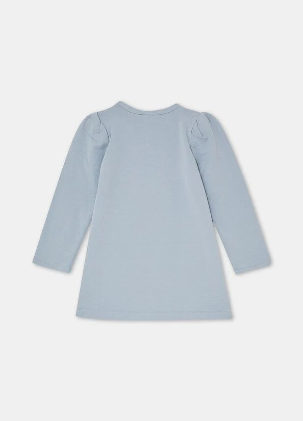Abito in felpa di cotone stretch, strass applicati, logo con strass, girocollo, colore azzurro