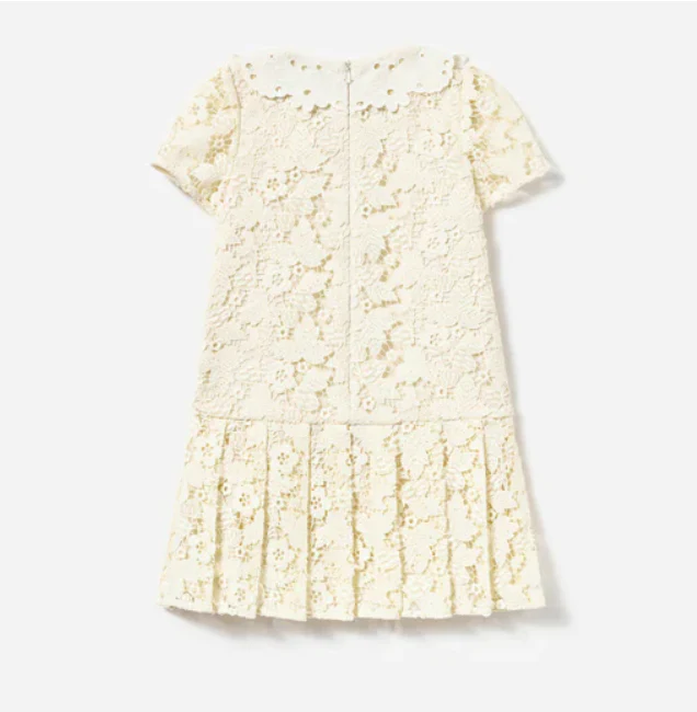 Abito mini me, tagliato in pizzo color crema a farfalla e sormontato da bordini in pizzo e motivi a fiocco, orlo plissettato, chiusura con cerniera sul retro, vita scesa, bordi in pizzo sulla scollatura, colore bianco