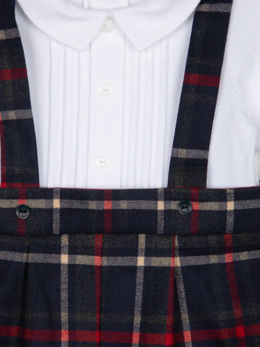 Abito neonato con pantaloncini scozzesi, bretelle regolabili e camicia bianca in jersey a maniche lunghe