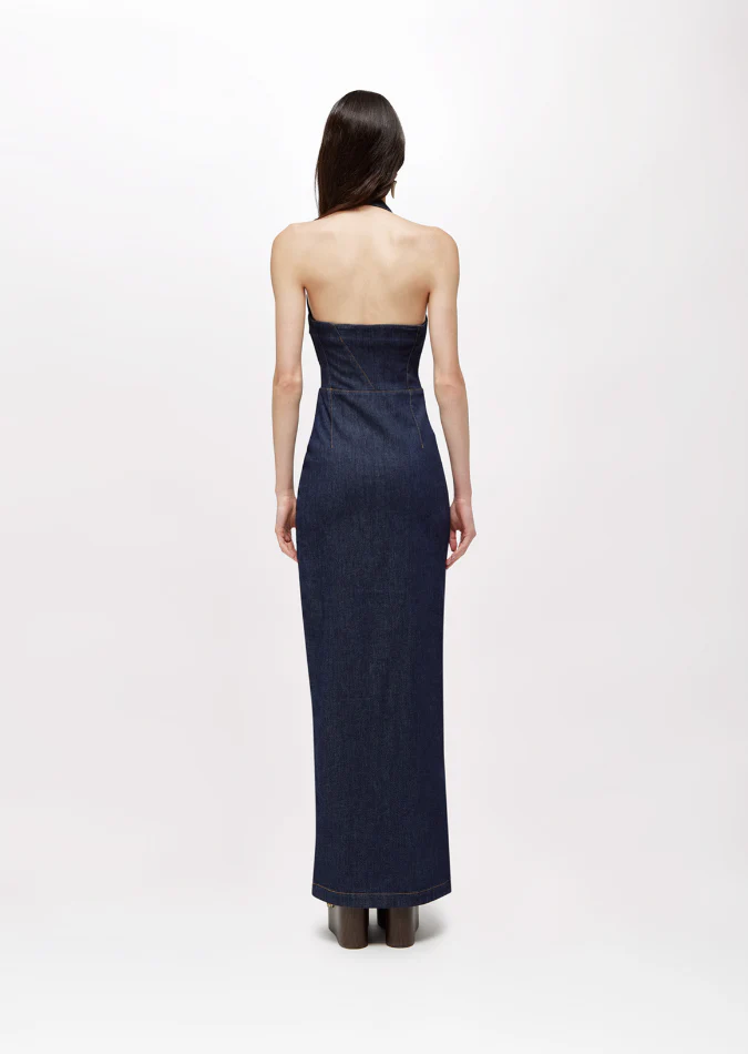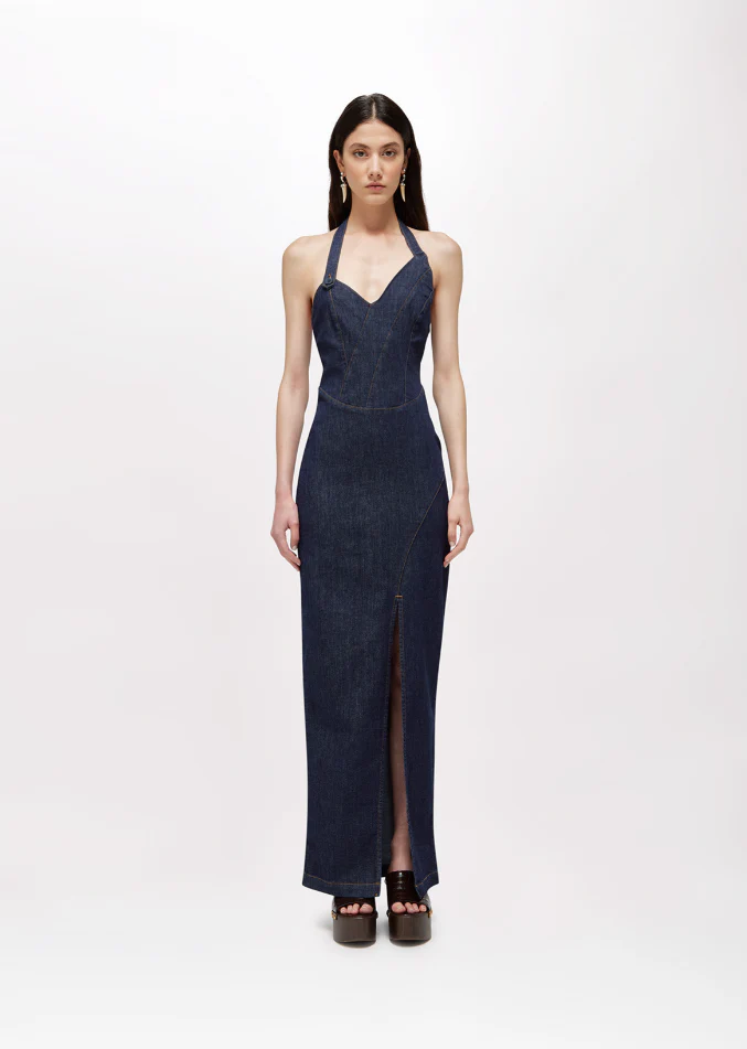 Abito lungo a tubino, realizzato in leggero denim di cotone stretch con spalline, scollatura a cuore, spacco asimmetrico, chiusura con zip al fianco