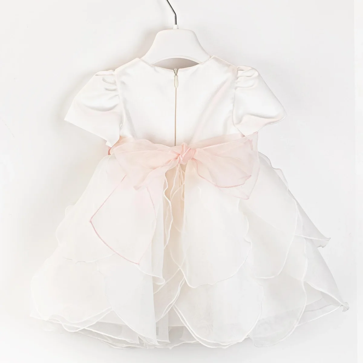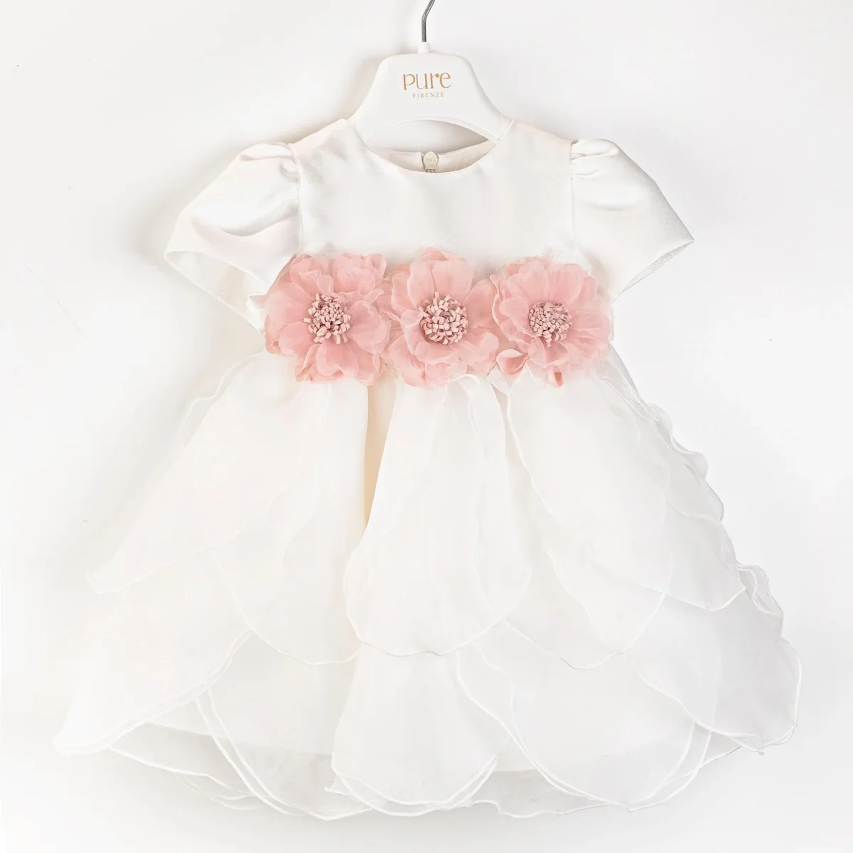 Abito neonata Pure Firenze, maniche corte, dettaglio con gonna ampia, cintura in fita con fascia e ricamo fiori in contrasto
