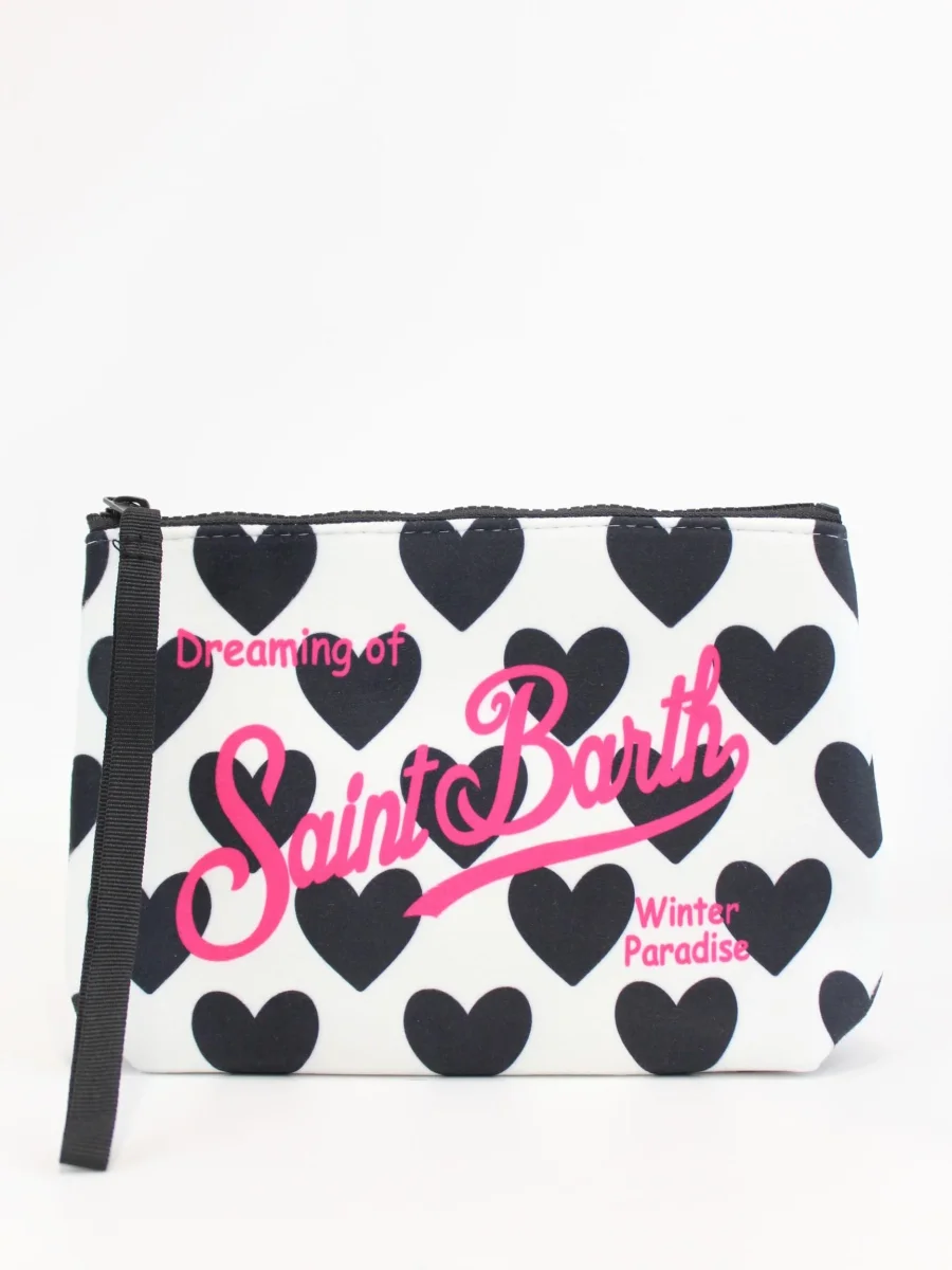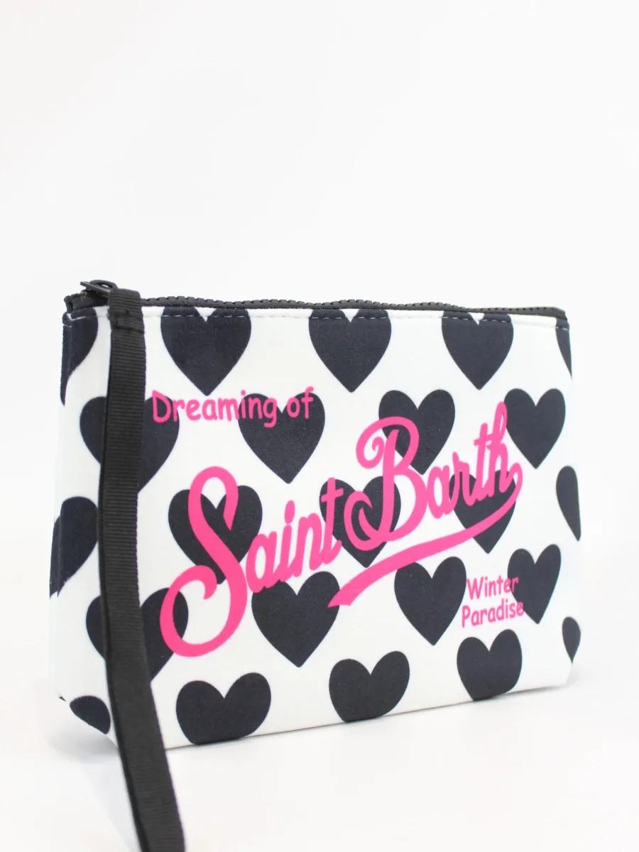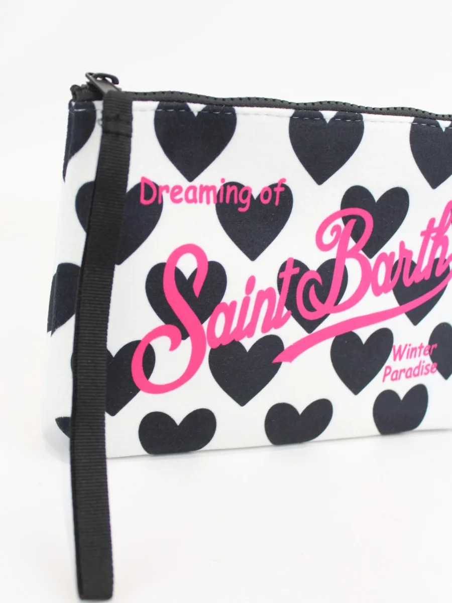 Pochette Aline Mc2 Saint Barth x trudi, modello con chiusura zip, polsiera fissa, dettaglio logo e cuori