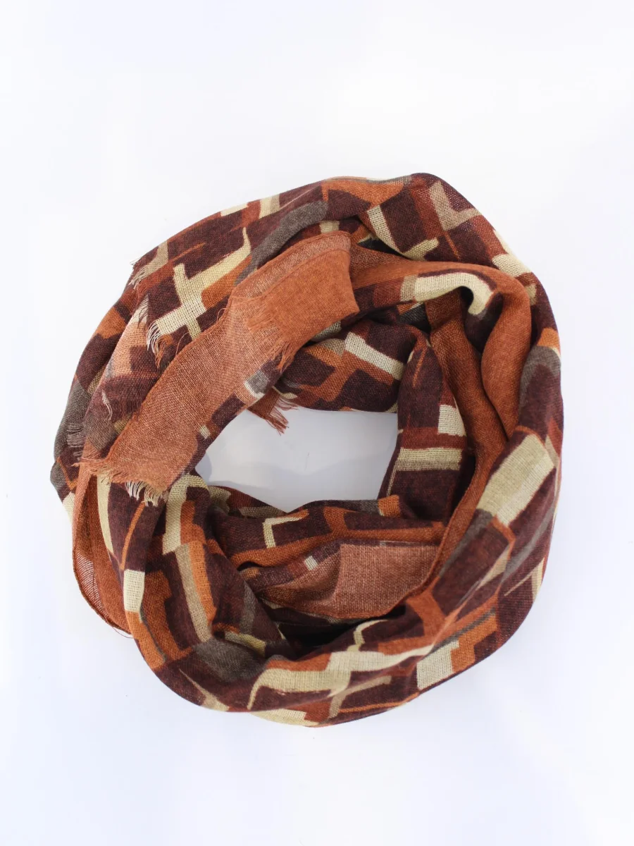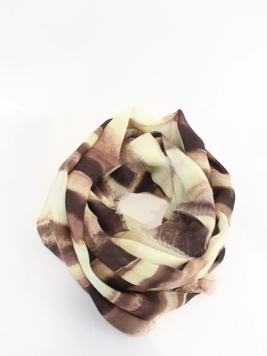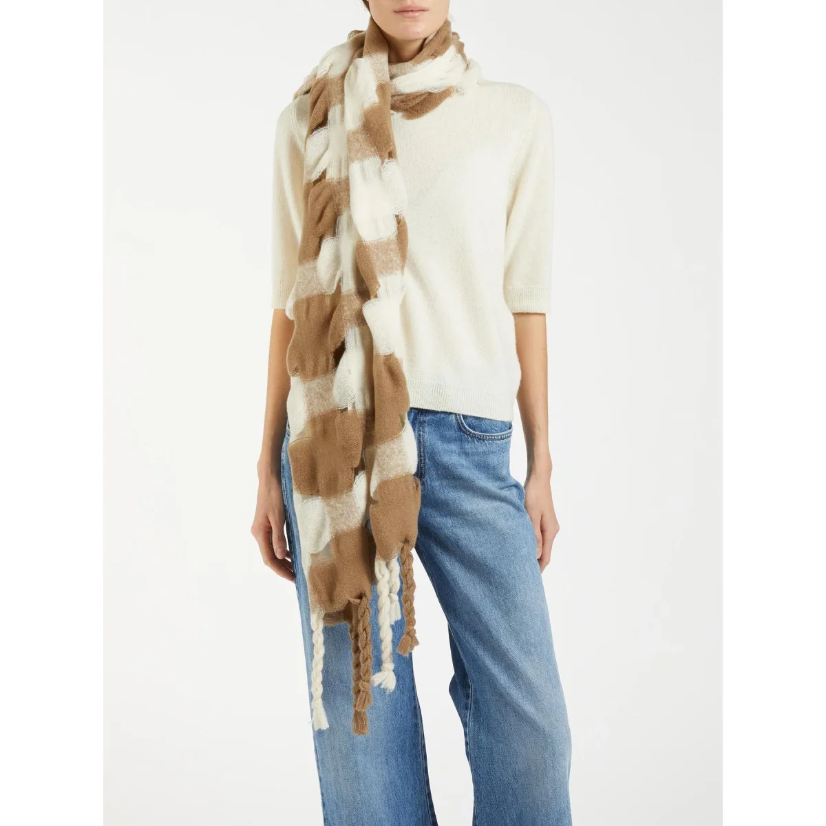 Sciarpa in tessuto con traforo e disegno check in contrasto, frange intrecciate sui lati corti, colore beige