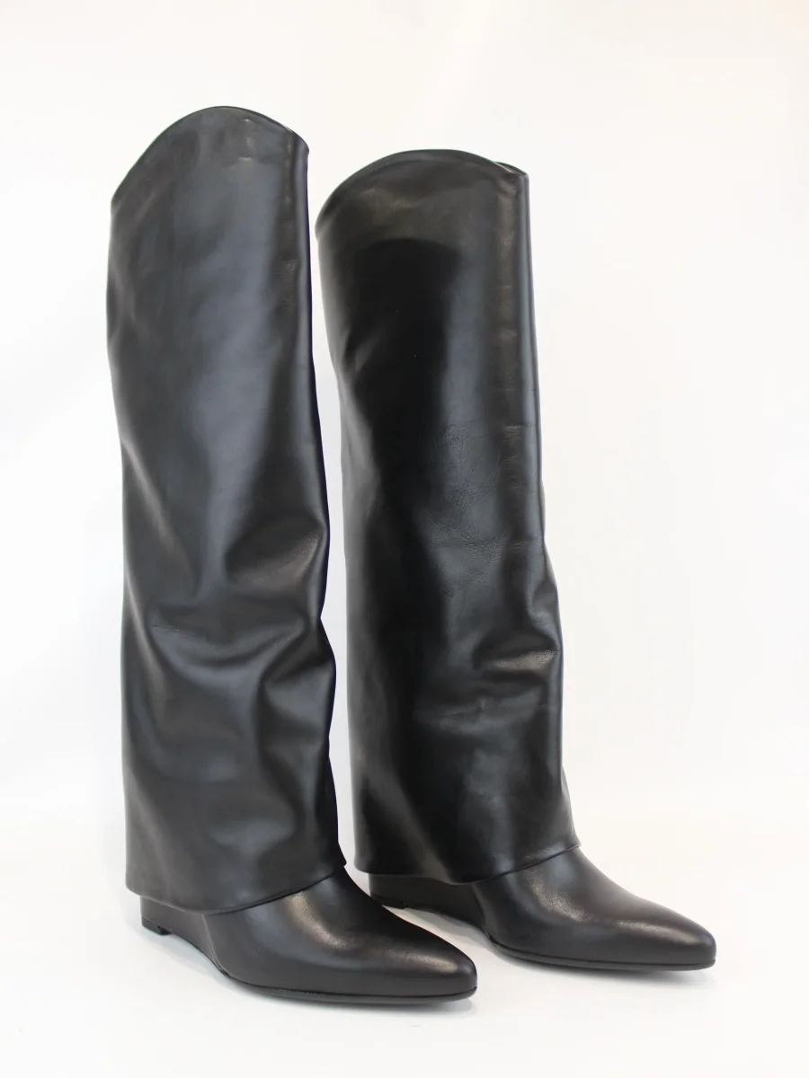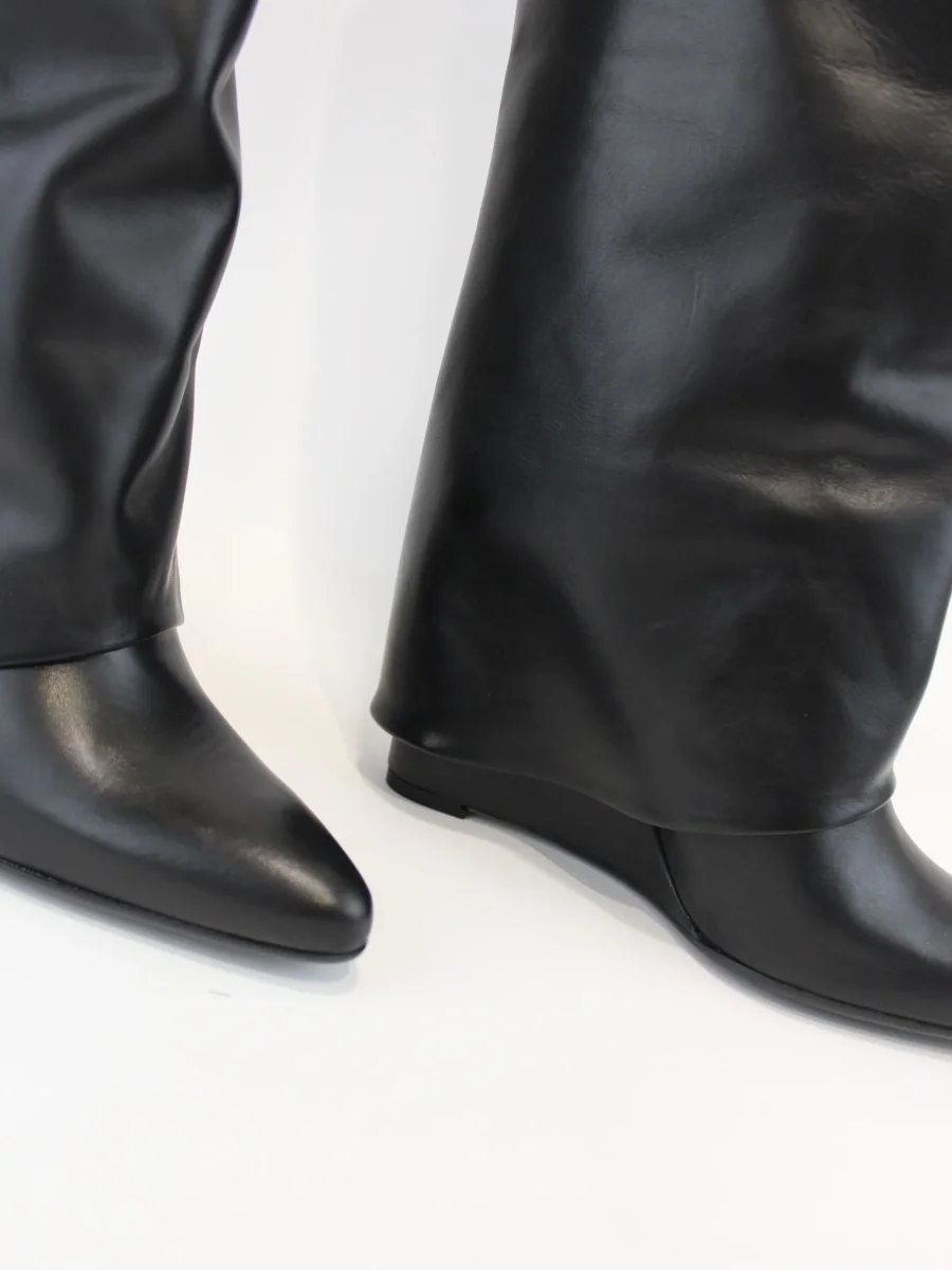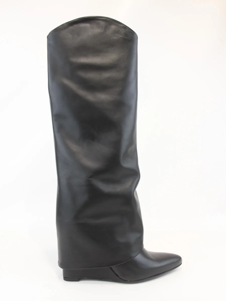Stivale Ovyè donna, modello in pelle di vitello nera, dettaglio risvolto, punta fina, gambale alto, tacco 9cm, suola in gomma