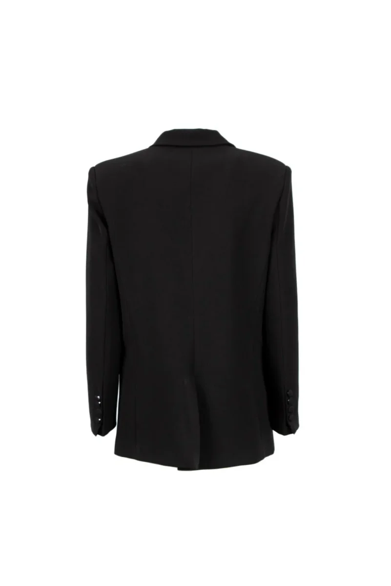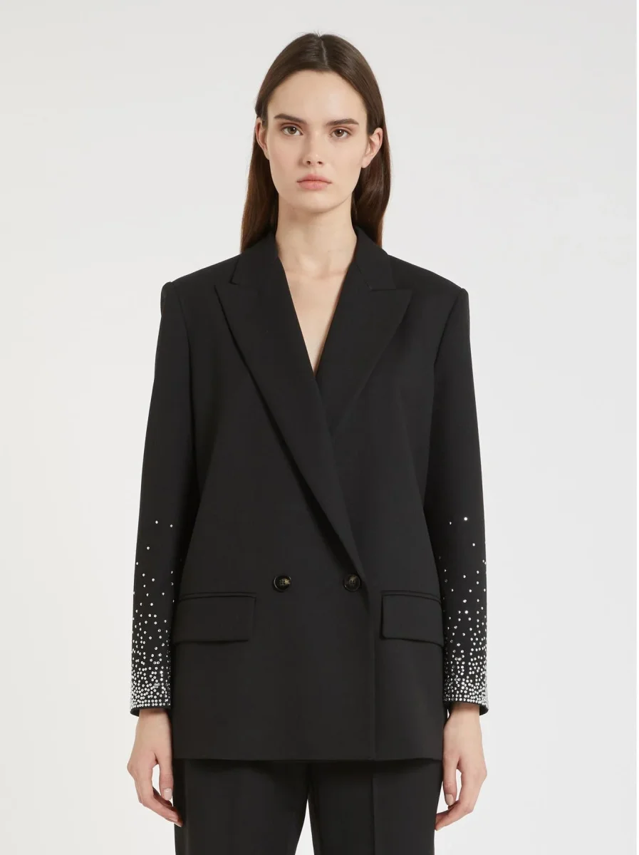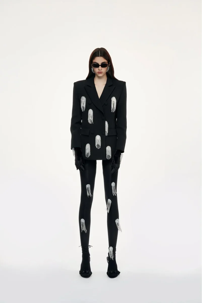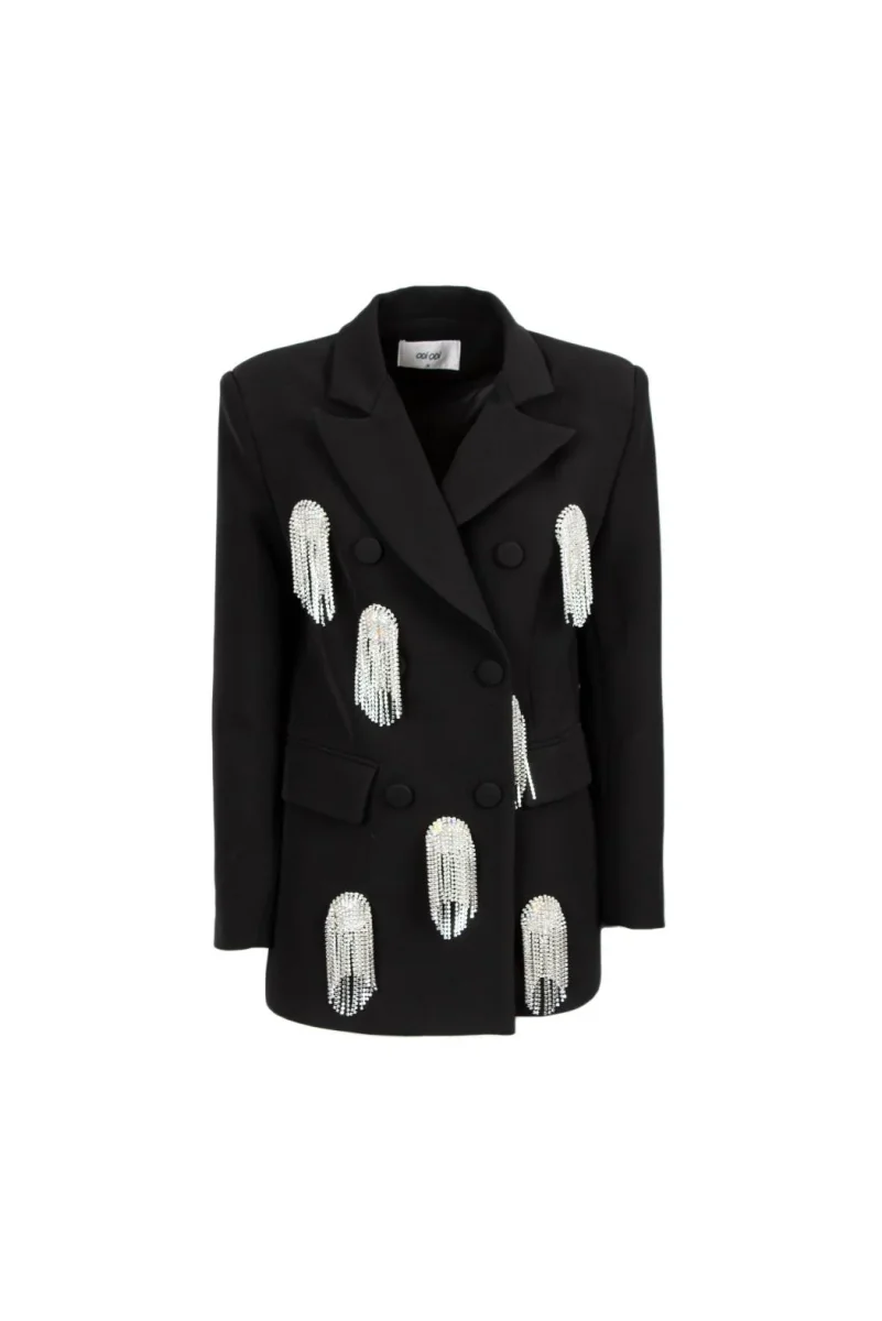 Giacca doppiopetto revers a lancia, spalle segnate e bottoni ricoperti, decorazione con frange e strass sul davanti, colore nero