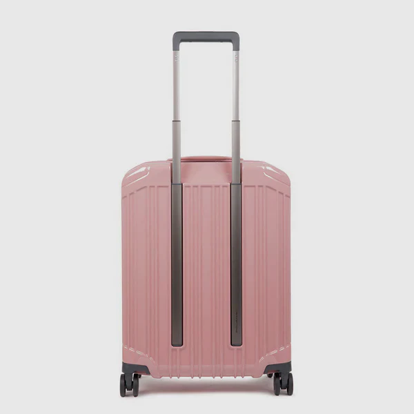 Trolley ryanair cabina Piquadro, modello ultra slim a 4 ruote con chiusura singola con lucchetto TSA. Realizzata in policarbonato con manici singoli a scomparsa, targhetta sganciabile e tasca porta oggetti fissa