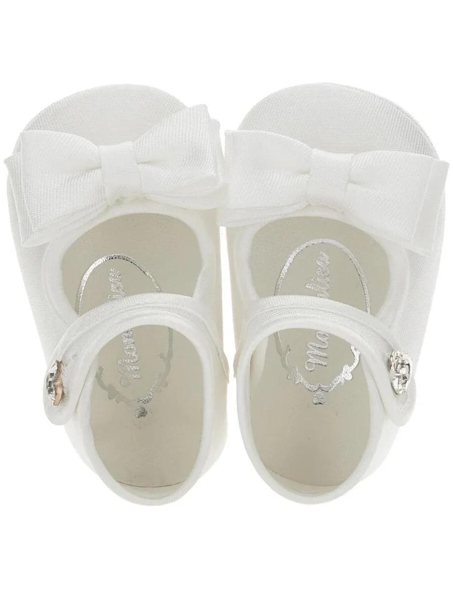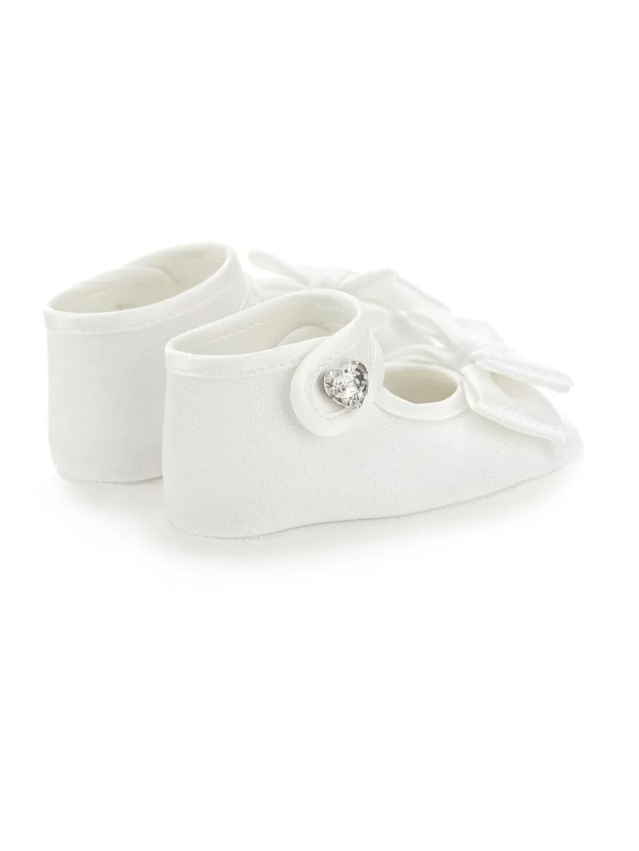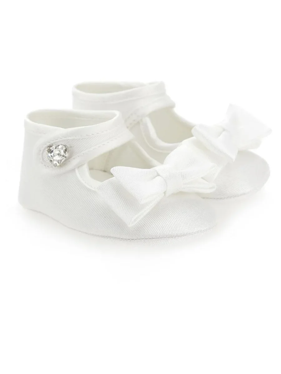 Ballerina Monnalisa in tessuto mikado, bottoncino gioiello, fiocchetto applicato sul davanti e intersuola morbida, colore bianco