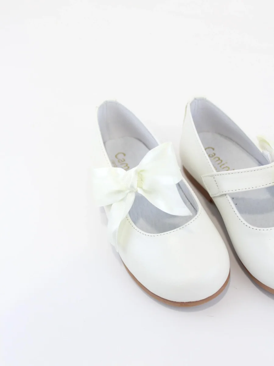 Ballerina Caminito bambina, modello aperto sul collo, fiocco in raso in tono, colore bianco