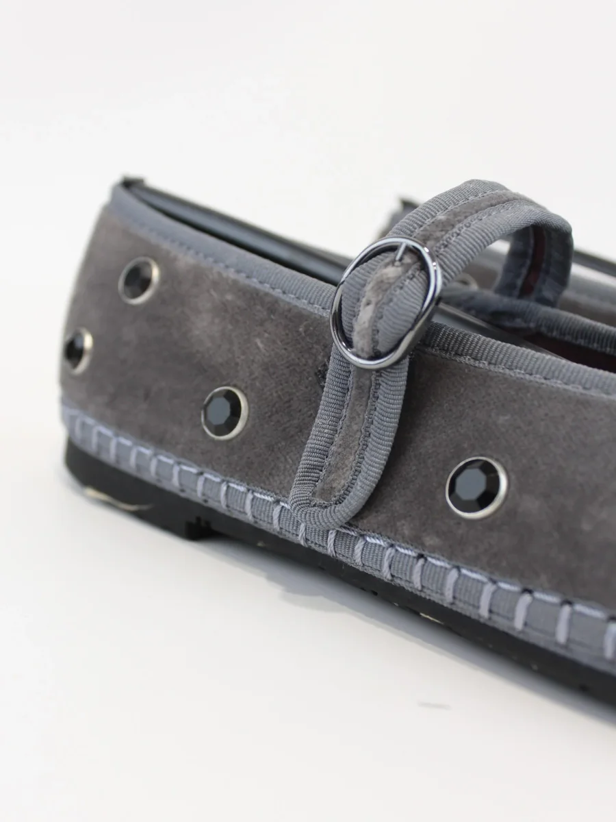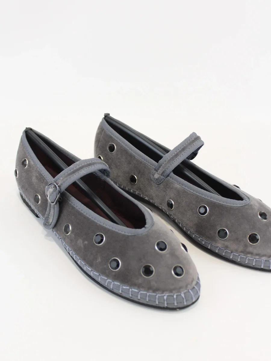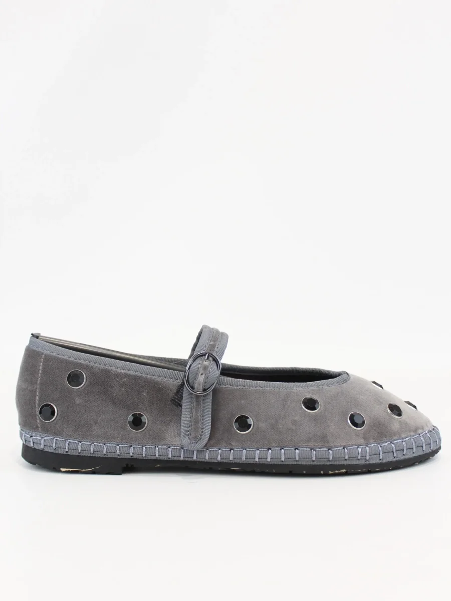Ballerina in velluto con scollo V, color grigio, cinturino allacciato in vernice e chiusura con fibbia, suola in gomma