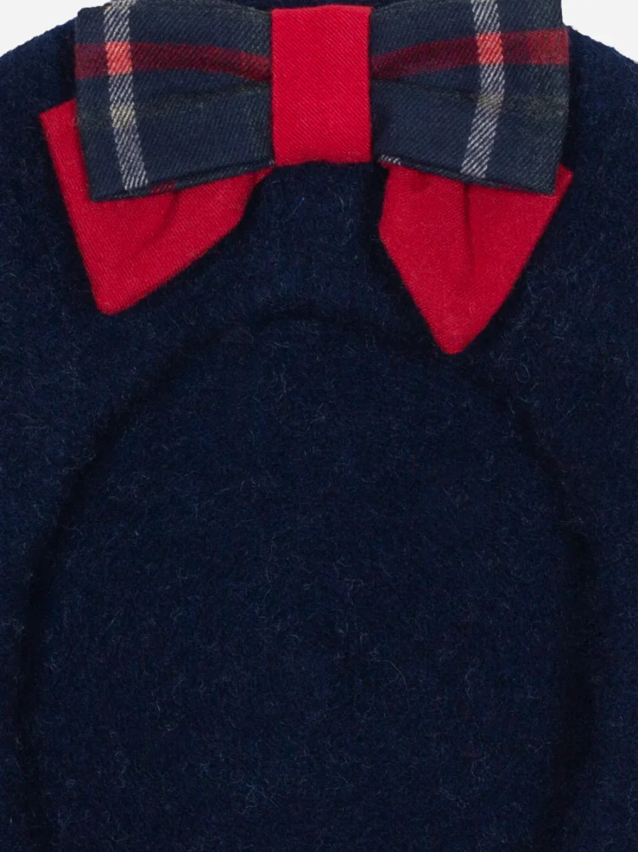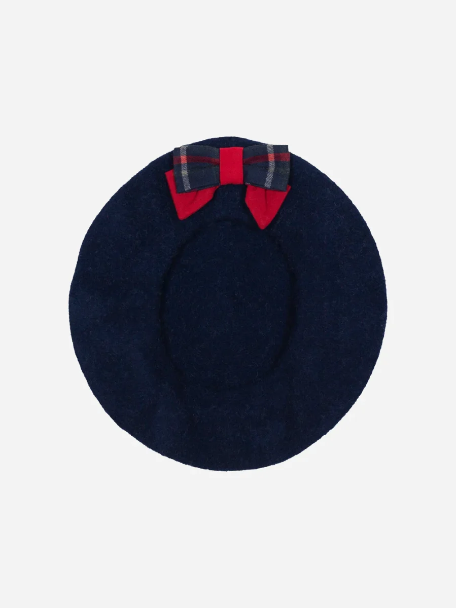 Questo elegante basco blu navy è realizzato in morbida lana e presenta un grazioso fiocco tartan sul lato.