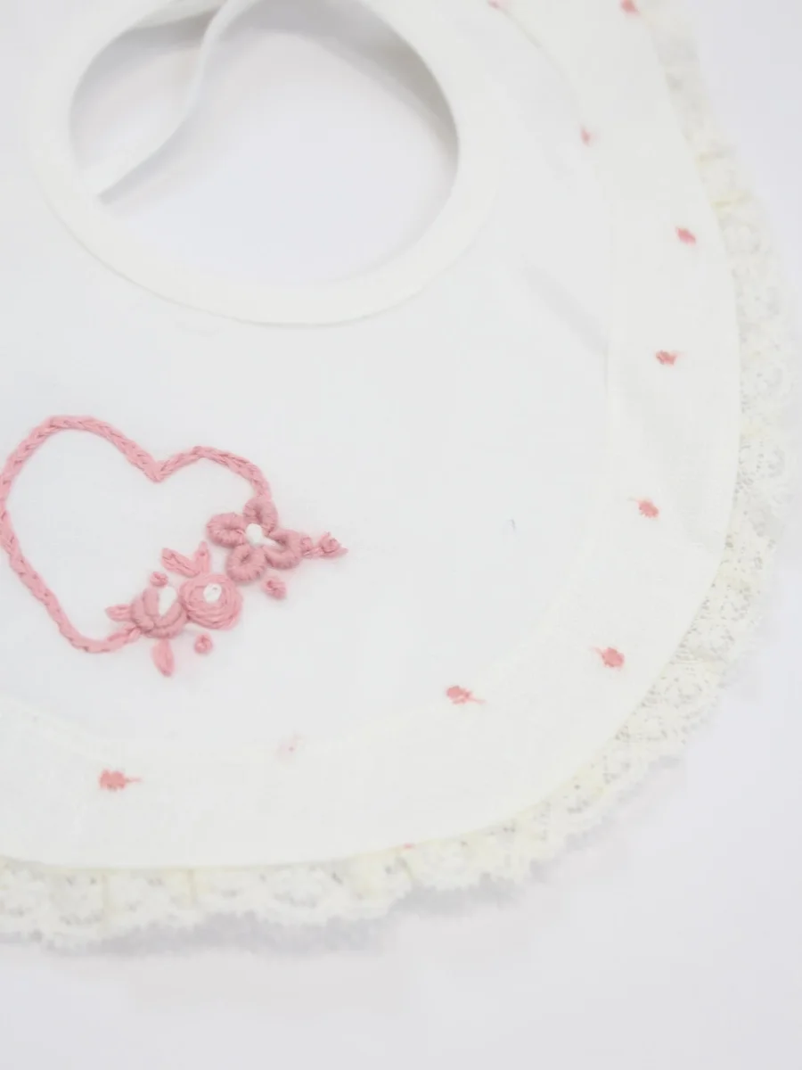 Bavetta neonata Piccola Giuggiola, rifinito da intarsi in pizzo e dettagli rifiniti a mano, colore bianco e rosa