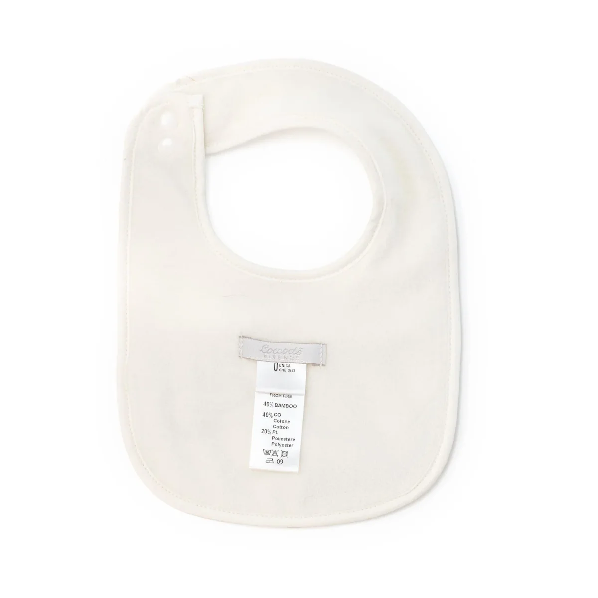 Bavetta con ricamo neonato, modello rotondo con chiusura bottoncino e ricamo in contrasto, colore bianco latte